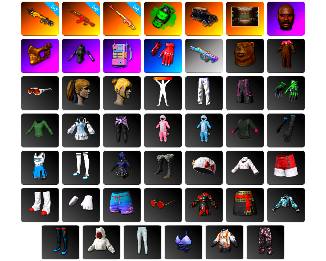 编号SP1103皮肤:7级小兔MK12 6级圣诞AK 3级德拉贡 翡翠色烟雾弹 帮派SUV 交易所接待室 黑鬼 金面 发光手臂 电磁背包 阿狸 Aixleft 杂技熊头套 杂技熊玩偶服 Number 小马尾 丸子头 人型看板 星魂猛虎下山运动裤 坏兔子短裤 朱芳芳手套 冬梦女孩 冰雪天使连衣裙 战术科技裤 粉鲨宝宝连身睡衣 蓝鲨宝宝连身睡衣 特工小兔长袖上衣 小队队长 小队队长 小队队长 银河系女孩 银河系女孩 冬梦女孩 冬梦女孩 冬梦女孩 冬梦女孩 星际小兔 极光之友 蓄势待发 蓄势待发 蓄势待发 蓄势待发 蓄势待发 柴犬帮 柴犬帮 亮片炫彩 维寒迪雪上运动夹克 维寒迪长裤 老奶奶睡裙 先驱战队 先驱战队 先驱战队 先驱战队 先驱战队 先驱战队 先驱战队 先驱战队 先驱战队 先驱战队 圣诞之子夹克 圣诞之子长裤 快乐冬眠蝴蝶结上衣 快乐冬眠蝴蝶结短裤 快乐冬眠花边上衣 快乐冬眠花边短裤 头号主播 战术科技夹克 金墨点染 金墨点染 金墨点染 群雄逐鹿 金墨点染 开拓者长裤 强袭者短裤 强袭者短鞋 强袭者上衣 强袭者夹克 魔力甜心萨莉的礼服(粉红色) 萨莉的皮鞋 萨莉的礼服 萨莉的长靴 萨莉的礼服 萨莉的皮鞋 萨莉2级头 小兔航天局 小兔航天局 小兔航天局 小兔航天局 小兔航天局 小兔学院 发型60 发型59 守护兽的凝视 PUBG x NewJeans 双龙出海 恶魔的微笑 斗牛犬之怒 - 头盔(1级) 柴犬帮头盔(2级) 柴犬帮头盔(3级) 糖果突击 - 头盔(1级) 蓝鲨宝宝 - 头盔(2级) 天翔队长 - 头盔(1级) Carbon Fiber Commando - Helmet (Level 2) 北极游牧者 - 头盔(2级) Vikendi Varsity - Helmet (Level 2) 粉梦长眠 - 头盔(2级) 锦鲤随行 - 头盔(2级) 战士阿冰 - 头盔(3级) 守望之龙 - 头盔(3级) 圣诞型男 - 头盔(3级) 小兔航空航天局 - 头盔(3级) 8th Anniversary - Helmet (Level 3) 炼狱之角 蓝鲨宝宝背包(2级) 柴犬帮背包(1级) 我的糖果曲奇背包(2级) 柴犬帮背包(2级) 汪汪伙伴背包(2级) 小兔航空航天局背包(2级) 2级包 一夜好眠背包(3级) 甜蜜梦境背包(3级) 炼狱之角背包(2级) Vikendi Varsity Parachute 快乐小熊降落伞 冬雪欲来降落伞 为你疯狂降落伞 34赛季伞 荣都华彩降落伞 烈焰吐息降落伞 雪花 妖魔横行降落伞 晚秋-M416 暴脾气 - M416 [战场痕迹] 小兔巡逻队 - M416 PGC 2021 群雄逐鹿 - Beryl M762 [战场痕迹] 危险玩偶屋 - Beryl M762 鎏金王朝 - Beryl M762 宝藏猎人 - Beryl M762 魔力甜心萨莉的挚友 - AKM 竞速之道 - AKM 标准猎手 - AKM 鲜花之力 - AKM 渗透与破坏 - AKM 粗糙 (橙色) - AKM 彩糖蛋糕 - AUG 镀银 - AUG 金色续响 - AUG 守望之龙 - AUG 嗜血者 - AUG 糖果碗 - ACE32 窒息的爱 - ACE32 霓虹之星 - SCAR-L 蔚蓝挑战者 - SCAR-L 假日精神 - SCAR-L 皇家舰队 - M16A4 甜蜜外衣 - M16A4 分形几何 - QBZ 灰色系 - Mk47 Mutant 淡雅之力 - Mk47 Mutant 灵魂枷锁 - Mk47 Mutant 这不是玩具 - Mk47 Mutant Blue Magic Blaster - G36C 钴蓝呼号 - G36C 方形铬印 - Groza 无尽迷宫 - Groza 山花烂漫 - Groza 无拘来世 - K2 大理石宝藏 - SLR 彩虹之上 - SLR [战场痕迹] 赛博危机 - SLR 卡拉金瑰宝 - SLR 假日精神 - SKS [战场痕迹] 漫彩四溢 - SKS 礼品店 - SKS 甜蜜外衣 - Mini14 彩虹之上 - Mini14 红桃同花 - Mk12 守望之龙 - Mk12 孙悟空 - Mk14 爬行者之印 - VSS 璀璨星光 - QBU 这个夜晚不太静 - 德拉贡诺夫 镀金 - Win94 [战场痕迹] 镀金枪儿响叮当 - Kar98k 无慈悲 - Kar98k 鲜花之力 - AWM [战场痕迹] 湮灭 - M24 彩糖蛋糕 - 莫辛纳甘步枪 Starstruck - MP5K 睡衣派对保护者 - JS9 赛季32竞技黄金 - P90 竞速之道 - P90 Poof! - PP-19 Bizon 彩虹之上 - UMP 银河小队 - UMP 海藻来帮忙 - UMP 雪国风光 - 汤姆逊冲锋枪 金色守护者 - P90 抽象派 - MP9 嗜血者 - Vector 精工美术 - 汤姆逊冲锋枪 圣诞之力 - DP-28 指绘 - Micro UZI [战场痕迹] 无重力 - M249 幽灵之握 - DBS 海藻自己上 - O12 都市猎手 - 锯短型霰弹枪 镀银 - S12K 钴蓝呼号 - S1897 抽象派 - S1897 礼品店 - S686 数码沙漠迷彩 - P92 愉悦的绿松色 - P1911 圣诞之力 - P18C 朋克战斧 礼品店 - 十字弩 山花烂漫 - 十字弩 你的第一锅 - 平底锅 8th Anniversary - Pan 午餐肉的护手绷带 赛博小兔手套 维纳斯俱乐部手部装饰 沙滩宝贝美甲配手环 队长的迷彩手套 准备就绪手套 维寒迪雪上运动手套 恶意侦测者手套 邓肯的手套 熊猫手套 窒息的爱袖套 甜蜜梦境手套 字节意志手套 寻腥猎犬手套 霓虹纹饰手套 法老守护者手套 般若手套 豹子精手饰 无重力重型手套 网格手套 书虫眼镜(棕色) 荣都学者眼镜 炫酷墨镜 时髦墨镜(黑色) 沙滩宝贝智能眼镜 暗影突袭者墨镜 快乐冬眠墨镜 无重力重型护目镜 小红帽的伤痕 维纳斯面部妆容 龙之女皇眼影 夏日之星妆容 女性面容8 男性面容9 小胡子 Gameday Makeup 冬梦女孩妆容 绒毛伙伴妆容 发型65 发型13 发型58 发型30 发型55 发型45 发型50 发型85 发型64 Hairstyle 81 发型78 发型72 一帆风顺背包(3级) 战士阿冰背包(3级) 恐龙地带背包(3级) 同花大顺背包(2级) 锦鲤随行背包(2级) 躲兔兔背包(2级) 皮革背包(2级) 圣龙之心背包(2级) Vikendi Varsity Backpack (Level 2) 粉梦长眠背包(2级) 维寒迪雪上运动背包(1级) 沙滩风情背包(1级) 法兰绒背包(1级) 都市丛林 - 头盔(3级) 维寒迪雪上运动 - 头盔(1级) 百变小丑 - 头盔(1级) 高科技时尚小兔面罩 波尔卡圆点缎带草帽 准备就绪鸭舌帽 渔夫帽 渔人的帽子 熊猫发箍 恶意侦测者头盔 甜蜜梦境贝雷帽 赛博小兔发带 W.I.A 牛仔布兔耳帽 W.I.A 双马尾小熊针织帽 豹子精渔夫帽 Winter Cheerleader Fur Hat 冰雪天使