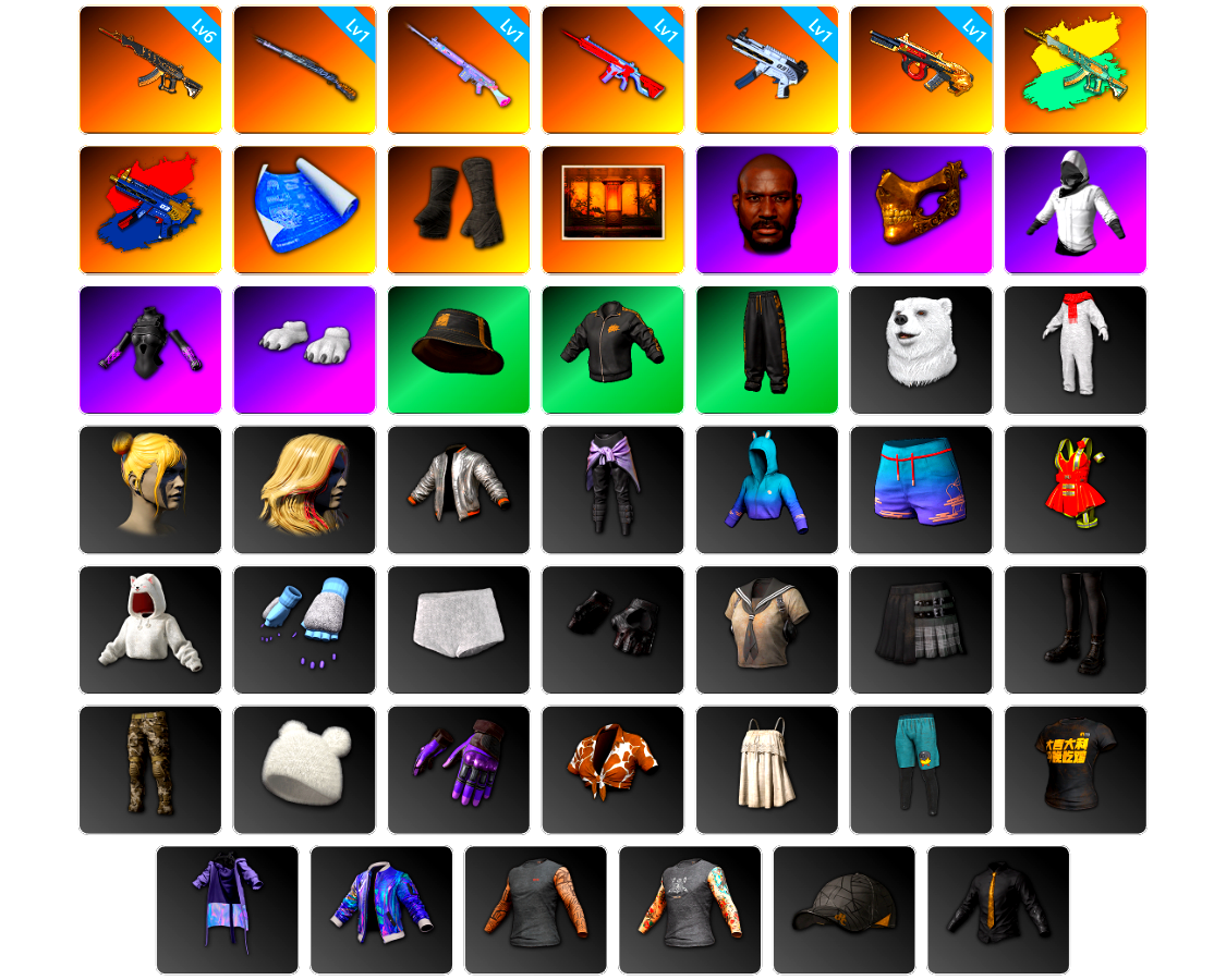 编号MXZ451皮肤:6级妖魔之触ACE 1级猛虎98k 1级玩偶炮 1级无信号M4 1级无重力MP5K 1级弥诺陶洛斯AUG 妖魔之触(异色) MP5K(异色) 张图纸 黑绷带 武器神龛 黑鬼 金面 白战神 发光手臂 白熊鞋 拉风龙 北极熊头套 北极熊连身衣 丸子头 发型56 银色美人飞行员夹克 战术科技裤 极光之友 极光之友 打工小兔制服 柴犬帮 宝贝外面冷 宝贝外面冷 维娜托手套 维娜托水手 维娜托短裙 维娜托短靴 佣兵队长裤 棉花蕾丝绒 紫喵喵手套 奶牛印花绑结式上衣(棕色) 老奶奶睡裙 鸡警短裤 头号主播 战术科技夹克 Twitch Rivals 复古飞行员夹克 OGBG 纹身 蜘蛛纹身 金墨点染 金墨点染 金墨点染 群雄逐鹿 金墨点染 金墨点染 群雄逐鹿 群雄逐鹿 开拓者短鞋 魔力甜心萨莉的礼服(粉红色) 萨莉的皮鞋 萨莉的礼服 萨莉的长靴 小兔航天局 小兔航天局 小兔航天局 小兔航天局 小兔学院 兔兔也朋克面罩 绒毛小恶魔上衣 绒毛小恶魔夹克 绒毛小恶魔短裙 兔兔也朋克腿套 曼蒂的发箍 发型59 7周年快乐! 大猫狂怒 回归 让子弹飞 把钱交出来 双狼成行 狂人的摩托车 - 头盔(1级) 斑点狗 - 头盔(2级) 小兔航空航天局 - 头盔(3级) 新生的奇趣背包(2级) 王牌登场 7周年快乐背包(3级) 汪汪伙伴背包(3级) 踏浪而行降落伞 PNC 2022 连战连捷 - M416 PGC 2022 王牌登场 - Beryl M762 鎏金王朝 - Beryl M762 山花烂漫 - Beryl M762 [战场痕迹] 青花之力 - Beryl M762 [战场痕迹] 破碎元素 - AKM 魔力甜心萨莉的挚友 - AKM 绷带AK 大理石宝藏 - AKM 标准猎手 - AKM 金色落叶 - AKM 大理石宝藏 - ACE32 银河卫士 - SCAR-L 鸡斯卡 - SCAR-L 三重彩 - SCAR-L 粗糙 (橙色) - SCAR-L 游猎之旅 - M16A4 [BATTLESTAT] Abracadabra Automatic - QBZ 金色落叶 - Mk47 Mutant 灰色系 - Mk47 Mutant 这不是玩具 - Mk47 Mutant 灵魂枷锁 - Mk47 Mutant Blue Magic Blaster - G36C 丛林潜行者 - G36C 标准猎手 - G36C 分形几何 - G36C 铜色猎手 - Groza 无尽迷宫 - Groza 标准猎手 - Groza 山花烂漫 - Groza 水手 - K2 无拘来世 - K2 大理石宝藏 - SLR 水手 - SLR 分形几何 - SKS 金色落叶 - SKS 镀金 - SKS 幸运骑士 - SKS 甜蜜外衣 - Mini14 [战场痕迹] 黑暗深渊 - Mini14 数码沙漠迷彩 - Mini14 爬行者之印 - VSS 海洋哑光(蓝色) - VSS 标准猎手 - VSS 鎏金王朝 - QBU 海洋哑光(绿色) - QBU 无信号 - QBU 致命快递 - 德拉贡诺夫 余音环绕 - 十字弩 数码沙漠迷彩 - Win94 [战场痕迹] 金色落叶 - Kar98k 数码沙漠迷彩 - Kar98k 鲜花之力 - AWM 数码丛林迷彩 - AWM 镀金 - AWM [战场痕迹] 湮灭 - M24 [战场痕迹] 粉梦长眠 - M24 幸运骑士 - M24 海洋哑光(蓝色) - 莫辛纳甘步枪 无拘来世 - 莫辛纳甘步枪 灰色系 - MP5K 海洋哑光(绿色) - MP5K 标准猎手 - MP5K 双色 - MP5K Poof! - PP-19 Bizon 双色 - PP-19 Bizon 沙漠烈阳 - PP-19 Bizon 游猎之旅 - UMP 海藻来帮忙 - UMP 标准猎手 - UMP 水手 - 汤姆逊冲锋枪 愉悦的绿松色 - 汤姆逊冲锋枪 翡翠之刃 - Vector 鲜花之力 - Vector 精工美术 - 汤姆逊冲锋枪 灵魂枷锁 - Vector 淡雅之力 - Micro UZI 水手 - Micro UZI 无信号 - Micro UZI 冲锋枪 爬行者之印 - M249 游猎之旅 - DP-28 无拘来世 - DP-28 灰色系 - DBS 标准猎手 - 锯短型霰弹枪 数码沙漠迷彩 - 锯短型霰弹枪 游猎之旅 - S12K 波涛荡漾 - S12K 标准猎手 - S12K [战场痕迹] 无信号 - S12K 这不是玩具 - S1897 水手 - S1897 灰色系 - S686 双色 - S686 海洋哑光(蓝色) - S686 波涛荡漾 - S686 标准猎手 - P92 三重彩 - P92 沙漠烈阳 - 沙漠之鹰 水手 - R1895 数码沙漠迷彩 - R45 双色 - P1911 沙漠烈阳 - P1911 水手 - P18C 数码丛林迷彩 - P18C 陶土质感大砍刀 带刺棒球棒 PUBG信条钢管 陶土质感撬棍 海洋哑光(蓝色) - 镰刀 妖魔大砍刀 恶战 - 十字弩 紫色雨滴 - 十字弩 甜蜜外衣 - 十字弩 山花烂漫 - 十字弩 标准猎手 - 十字弩 妙尔尼尔 - 平底锅 无畏小蜜蜂 - 平底锅 7周年快乐手套 哥特戒指 维纳斯俱乐部手部装饰 沙滩宝贝美甲配手环 小兔学院水手服手套 队长的迷彩手套 幸运怪盗手套 准备就绪手套 零度机能风摩托车手手套 字节意志手套 PGC 2022 战术科技手套 恩度若特技手套 PNC 2024 手套(蓝色) 飞行员太阳镜(暗红色) 乔纳森的猎人墨镜 马尔霍特拉的墨镜 死亡六进制太阳镜 炫酷蓝色墨镜 迷人鲜花耳环 维纳斯面部妆容 暗夜兔女郎妆容 PGC 2021 黑暗凝视妆容 龙之女皇眼影 女性面容17 女性面容21 女性面容10 狂人·马尔霍特拉 女性面容16 女性面容7 邓肯·斯莱德 男性面容10 发型11 发型39 发型66 发型65 发型14 发型19 发型38 发型45 发型26 发型20 发型64 钞能力背包(3级) 柯基帮背包(2级) 角鲨队背包(2级) 勇往直前背包(1级) 法兰绒背包(1级) 死亡六进制 - 头盔(2级) 石器时代 - 头盔(2级) PUBG信条 - 头盔(2级) 萌虎下山 - 头盔(1级) El Pozo 狂鸡队吉祥物头套 咆哮之力街头风面罩 麻辣小龙虾头套 驯鹿的红鼻子 角鲨队吉祥物头套 7周年快乐甜筒帽 旅游陷阱圆顶帽 快枪手牛仔帽 朱莉的帽子 准备就绪鸭舌帽 队长的迷彩鸭舌帽 渔夫帽 卡通袭击者针织帽 猩红猎手鸭舌帽 雪色美人帽 蓝仙女帽 寄情尼罗河渔夫帽 准备就绪口罩 PCS2 隐形生存者面巾 迷雾追踪者口罩 卡通袭击者眼罩 队长的迷彩面巾 朱莉的褐湾面罩 猩红猎手面具 泰戈生存者口罩 幸运怪盗面具 小可爱睡眠眼罩 字节意志面具 PGC 2022 战术科技面罩 炫酷反光夹克 蟒蛇花园夹克 准备就绪夹克 高科技时尚小兔夹克 咆哮之力街头风背心 烤鸡节吊带上衣 猛虎齿痕露脐上衣 夏日开襟上衣 零度机能风摩托车手夹克 PCS4 