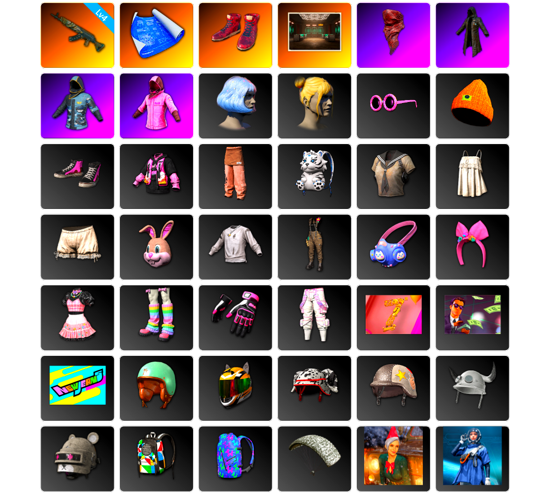 编号MXZ472皮肤:4级青龙762 张图纸 柏林鞋 交易所接待室 红面巾 黑大衣 小战神 粉战神 发型43 丸子头 暴躁花生墨镜 暴躁花生针织帽 暴躁花生运动鞋 暴躁花生连帽卫衣 暴躁花生长裤 星魂虎虎生威背包(3级) 维娜托水手 老奶奶睡裙 老奶奶睡裤 小兔学院 兔兔也朋克面罩 兔兔也朋克发箍 兔兔也朋克洋裙 兔兔也朋克腿套 悲喜 7周年快乐! 把钱交出来 PUBG x NewJeans 夏日安全 - 头盔(1级) 7周年快乐 - 头盔(1级) 斑点狗 - 头盔(2级) 群星之力 - 头盔(2级) 西游记 “熊宝贝” - 头盔(3级) PCS7 背包(2级) 7周年快乐背包(3级) 雪花 圣诞精灵套装 无重力轻型套装 无慈悲 - M416 雪国风光 - M416 魔女之力 - Beryl M762 蟒蛇花园 - AKM 多彩科技猫 - AUG 镀银 - AUG G-DRAGON - SCAR-L 三重彩 - SCAR-L 分形几何 - QBZ 金色落叶 - Mk47 Mutant 方形铬印 - Mk47 Mutant 无尽迷宫 - Mk47 Mutant 分形几何 - G36C 无尽迷宫 - Groza 雪花 - K2 彩虹之上 - SLR 金色落叶 - SKS [战场痕迹] 十字军 - SKS 数码沙漠迷彩 - Mini14 幽灵之握 - Mk12 雪国风光 - Mk14 分形碎片 - VSS 蟒蛇花园 - QBU 余音环绕 - 十字弩 粗糙 (橙色) - Kar98k 猪八戒 - AWM 镀金 - AWM G-DRAGON - M24 标准猎手 - MP5K 雪花 - MP5K 方形铬印 - PP-19 Bizon 标准猎手 - UMP 竞速之道 - UMP 雪国风光 - 汤姆逊冲锋枪 心跳掠夺者 - MP9 灵魂枷锁 - Vector 钴蓝呼号 - Micro UZI 数码沙漠迷彩 - Micro UZI 无拘来世 - DP-28 雪花 - DP-28 幽灵之握 - DBS 朱雀之灵 - O12 锁链帮 - S12K 无尽迷宫 - S12K 镀银 - S12K 毒性 - S1897 淡雅之力 - S686 水手 - R1895 水手 - P18C 锦衣夜行佩刀 陶土质感大砍刀 标准猎手 - 十字弩 你的第一锅 - 平底锅 7周年快乐 - 平底锅 赛博小兔手套 7周年快乐手套 维纳斯俱乐部手部装饰 兔兔也朋克手套 侠盗猫手部装饰 队长的迷彩手套 准备就绪手套 秉烛罪人手套 熊猫手套 PGC 2022 战术科技手套 使徒墨镜 荣都学者眼镜 时髦墨镜(红色) 聚星女士的植入体 维纳斯面部妆容 哥特孩童妆容 寒锋背包(3级) 雪片背包(2级) 沙滩风情背包(1级) 独行侠背包(1级) 鲨鱼咬痕 - 头盔(1级) 锦衣夜行斗笠 7周年快乐甜筒帽 准备就绪鸭舌帽 队长的迷彩鸭舌帽 传奇高手鸭舌帽 老奶奶的睡帽 冰霜公主针织帽 侠盗猫针织帽 秉烛罪人面具 熊猫发箍 赛博小兔发带 圣诞条纹围巾(红色) 准备就绪口罩 队长的迷彩面巾 赛博小兔口罩 侠盗猫面具 准备就绪夹克 我的闪耀时刻连帽夹克 秉烛罪人夹克 水色突击夹克 怪盗小兔上衣 夏日烈阳背心 维纳斯俱乐部服饰 小小鸡仔外套 夜店礼服(白色) 紧身连衣裙(红色) 春之漫游连衣裙 7周年快乐夹克 衬衫 (灰色) 小小鸡仔T恤 Los Leones 狮王队主场队服 锦衣夜行装束 朋克摇滚长裤 准备就绪长裤 朱莉的潜行者裤袜 水色突击长裤 GLL大满贯磨损的牛仔裤 牛仔裤 (棕褐色) 侠盗猫短裤 小小鸡仔短裤 7周年快乐短裙 夏日向日葵短裙 我的闪耀时刻短裙 老奶奶的拖鞋 缤纷混沌布鞋 准备就绪运动鞋 夜店风丝袜 秉烛罪人铁鞋 冰雪女王长靴 维纳斯俱乐部丝袜配长靴 7周年快乐长靴 我的闪耀时刻网袜配短靴 “彩色标记” 达西亚轿车 锈红防弹衣(3级) 想尝一口吗? 胜利之舞85 胜利之舞113 胜利之舞118 胜利之舞124 胜利之舞 - 7周年纪念 胜利之舞30 蹲蹲扭扭 #1 嫉妒 棒棒哒 挑衅 投降 不耐烦 谢谢 停止! 抖缩 庆祝 同意 反对 你好 大厅姿势2 大厅姿势1 你完蛋了 耸肩 过来 喂我你的灵魂吧 寒冬 祝你好运 生存等级:1段