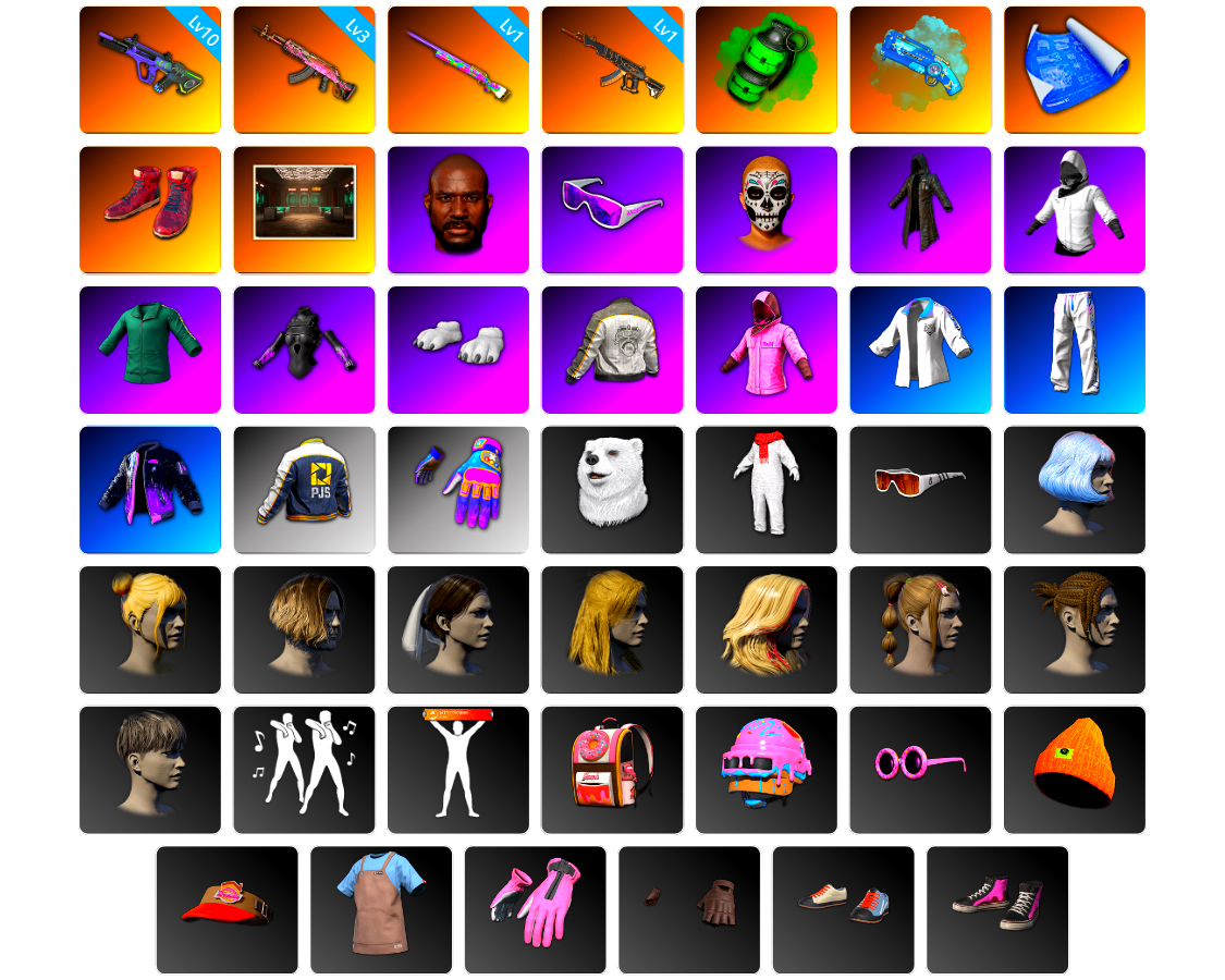 编号WJ131皮肤:10级霓虹AUG 3级火麒麟 1级彩虹M24 1级妖魔之触ACE 翡翠色烟雾弹 蓝色魔法迷雾-M79 张图纸 柏林鞋 交易所接待室 黑鬼 滑雪镜 亡灵律动妆容 黑大衣 白战神 活动绿东 发光手臂 白熊鞋 PML夹克 粉战神 星魂猛虎下山运动夹克 星魂猛虎下山运动裤 飞行员夹克 PJS夹克 Aixleft 北极熊头套 北极熊连身衣 Number 发型43 丸子头 发型21 萨迪娅的头纱 西游记 发型56 发型61 脏辫 发型24 青海摇 人型看板 唯一甜甜圈背包(3级) 果酱甜甜圈 - 头盔(3级) 暴躁花生墨镜 暴躁花生针织帽 甜甜圈遮阳帽 釉彩甜甜圈衬衫 釉彩甜甜圈手套 甜甜圈手套 釉彩甜甜圈运动鞋 暴躁花生运动鞋 甜甜圈运动鞋 甜甜圈短裤 暴躁花生连帽卫衣 暴躁花生长裤 甜甜圈上衣 釉彩甜甜圈运动裤 星魂猛虎下山滑雪镜 电波干扰背包 日光下澈凉鞋 丝滑夏日凉鞋 漫步沙滩凉鞋 日光下澈丛林短裤 日光下澈热带短裤 丝滑夏日短裤(白色) 丝滑夏日短裤(橄榄绿) 日光下澈丛林上衣 日光下澈热带上衣 丝滑夏日上衣(白色) 漫步沙滩连衣裙(棕色) 漫步沙滩连衣裙(蓝色) 冬梦女孩 银色美人飞行员夹克 加油!连帽卫衣 闪亮运动裤 战术科技裤 猎手猫夹克 猎手猫上衣 猎手猫短裙 特工小兔长袖上衣 特工小兔长裤 小队队长 小队队长 银河系女孩 银河系女孩 冬梦女孩 冬梦女孩 冬梦女孩 星际小兔 小青龙头套 小青龙玩偶服 小青龙脚套 宝贝外面冷 宝贝外面冷 宝贝外面冷 宝贝外面冷 怨恨小姐 怨恨小姐 怨恨小姐 怨恨小姐 棉花蕾丝连衣裙 紫喵喵手套 紫喵喵卫衣 紫喵喵长裤 紫喵喵短靴 奶牛印花毛皮大衣(黑色) 维寒迪雪上运动夹克 维寒迪长裤 老奶奶睡裙 老奶奶睡裤 先驱战队 先驱战队 先驱战队 先驱战队 先驱战队 先驱战队 先驱战队 先驱战队 先驱战队 先驱战队 鸡警 鸡警短裤 圣诞之子夹克 圣诞之子长裤 头号主播 大吉大利T恤(红色) 战术科技夹克 Twitch Rivals 复古飞行员夹克 太阳之子电波干扰背包 晚餐幻象纹身 开拓者墨镜 开拓者手套 开拓者上衣 开拓者短鞋 萨莉的T恤 小兔学院 兔兔也朋克面罩 兔兔也朋克发箍 兔兔也朋克洋裙 兔兔也朋克腿套 发型60 悲喜 平底锅 守护兽的凝视 7周年快乐! 节日装饰 肾上腺素 催眠状态 潜水教练 - 头盔(3级) 柯基帮头盔(1级) 7周年快乐 - 头盔(1级) Carbon Fiber Commando - Helmet (Level 2) Vikendi Varsity - Helmet (Level 2) 奶牛印花 - 头盔(2级) 柠檬汁 - 头盔(2级) 战士阿冰 - 头盔(3级) 守望之龙 - 头盔(3级) 沙滩狂战士 - 头盔(3级) 迪厅镜面球 - 头盔(3级) 赫尔墨斯之翼 - 头盔(3级) 8th Anniversary - Helmet (Level 3) 炼狱之角 波普风 - 头盔(3级) PNC 2025 战术科技背包(3级) 来自乐园的问候背包(3级) PCS6 浓墨重彩背包(1级) 柴犬帮背包(2级) 春之野鹤背包(2级) 紫色棱镜背包(3级) 肆意挥洒背包(3级) 传奇高手旅行背包(3级) 7周年快乐背包(3级) 汪汪伙伴背包(3级) 高科技时尚小兔背包(3级) 芳心女猎手背包(3级) 柯基帮背包(3级) 奇袭背包 炼狱之角背包(2级) 废土拾荒者背包(3级) 甜甜圈之家降落伞 Vikendi Varsity Parachute 踏浪而行降落伞 冬雪欲来降落伞 PCS5 降落伞 特殊快递降落伞 雪花 蒸汽之翼降落伞 妖魔横行降落伞 乐园的问候 太阳之子降落伞 零度机能风套装 PGC 2019套装 雪色美人套装 晚秋-M416 [战场痕迹] 小兔巡逻队 - M416 糖霜乐园 - M416 绷带AK 多彩科技猫 - AUG 镀银 - AUG 金色续响 - AUG 嗜血者 - AUG G-DRAGON - SCAR-L 补丁 - SCAR-L 镀银 - SCAR-L 钴蓝呼号 - G36C 山花烂漫 - Groza 镀金 - Groza [战场痕迹] 剧变熔岩 - SKS 雪国风光 - Mk14 银河小队 - VSS 璀璨星光 - QBU 余音环绕 - 十字弩 礼物环绕 - Kar98k 碰撞测试 - AWM 海藻在路上 - M24 疯狂收割者 - M24 彩糖蛋糕 - 莫辛纳甘步枪 [战场痕迹] PNC 2025 战术科技 - MP5K 竞速之道 - P90 竞速之道 - UMP 钴蓝呼号 - UMP 雪国风光 - 汤姆逊冲锋枪 镀银 - 汤姆逊冲锋枪 心跳掠夺者 - MP9 金色守护者 - P90 翡翠之刃 - Vector 灰色系 - DBS 灵长类 - S1897 灰色系 - S686 礼品店 - S686 锦衣夜行佩刀 PUBG信条钢管 马桶塞 都市猎手 - 十字弩 恶战 - 十字弩 你的第一锅 - 平底锅 7周年快乐 - 平底锅 8th Anniversary - Pan 神秘危险品手套 暗黑心手套 7周年快乐手套 维纳斯俱乐部手部装饰 兔兔也朋克手套 沙滩宝贝美甲配手环 小兔学院水手服手套 人类猎手探险手套 人类猎手手套 驯鹿嬉戏手套 队长的迷彩手套 幸运怪盗手套 准备就绪手套 秉烛罪人手套 维寒迪雪上运动手套 邓肯的手套 熊猫手套 字节意志手套 霓虹纹饰手套 PGC 2022 战术科技手套 朱莉的褐湾手套 亡灵律动手套 都市耀光戒指 狂野姿态手镯套组 漫步沙滩手环 般若手套 豹子精手饰 时光探员手套 革面悍匪手套 暗夜追踪者手套 百叶窗太阳镜(银色) 女明星眼镜(黑色) 乔纳森的猎人墨镜 精致的眼镜 马尔霍特拉的墨镜 夏日爱心太阳镜 朱莉的潜行者墨镜 技工墨镜(白色) 朱莉的褐湾护目镜 沙滩宝贝智能眼镜 青花怒放太阳镜 暗影突袭者墨镜 老式太阳镜 都市耀光墨镜 卧底助理眼镜 美人鱼妆容 维纳斯面部妆容 哥特孩童妆容 马戏团之星妆容 龙之女皇眼影 喜极而泣眼影 夏日之星妆容 萨迪娅·库雷希 女性面容11 女性面容19 男性面容7 漫步沙滩妆容 时光探员妆容 Gameday Makeup 冬梦女孩妆容 发型54 发型66 马戏团之星发型 发型47 美人鱼发型 发型58 发型45 发型20 发型10 发型93 发型91 发型88 发型87 发型64 发型85 发型83 Hairstyle 81 发型78 迷彩旅