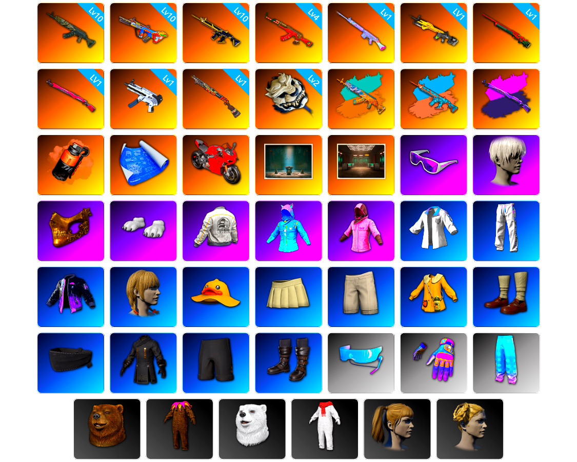 编号ZQ1002皮肤:10级青龙762 10级爆裂AUG 10级猪八戒M4 4级圣诞AK 1级玩偶炮 1级小兔MK12 1级孙悟空M24 1级午夜惊魂98K 1级无重力MP5K 1级烈日灼烧-S1897 2级白虎锅 青龙762(异色) 猪八戒(异色) 午夜惊魂98K(异色) 珊瑚色烟雾弹 张图纸 杜卡迪红 胜利密室 交易所接待室 滑雪镜 9s发型 金面 白熊鞋 PEL夹克 小叮当 粉战神 星魂猛虎下山运动夹克 星魂猛虎下山运动裤 飞行员夹克 小黄鸭 尼尔 Aixleft Aixleft Aixleft 杂技熊头套 杂技熊玩偶服 北极熊头套 北极熊连身衣 小马尾 西游记 发型61 发型24 人型看板 星魂猛虎下山滑雪镜 星魂虎耀星辉瑜伽上衣 冬梦女孩 冰雪天使连衣裙 卡通学院夹克 闪亮运动裤 紫色运动裤 猎手猫夹克 猎手猫上衣 猎手猫短裙 猎手猫皮鞋 冬梦女孩 冬梦女孩 冬梦女孩 冬梦女孩 星际小兔 塞壬的裙子 塞壬的鞋子 棉花糖帽子 棉花糖马甲 棉花糖T恤 棉花糖短裤 棉花糖鞋 蓄势待发 柴犬帮 宝贝外面冷 维娜托短靴 紫喵喵手套 维寒迪雪上运动夹克 维寒迪长裤 老奶奶睡裙 老奶奶睡裤 绸缎睡裤 圣诞之子夹克 圣诞之子长裤 薄荷巧克力 战术科技夹克 OGBG 纹身 蜘蛛纹身 金墨点染 金墨点染 群雄逐鹿 金墨点染 金墨点染 开拓者墨镜 强袭者上衣 萨莉的礼服 萨莉的皮鞋 萨莉2级头 小兔航天局 小兔航天局 小兔航天局 小兔航天局 小兔学院 降落伞 兔兔也朋克洋裙 哥特短裙 发型60 悲喜 守护兽的凝视 爱之小鸡 不朽金箍 舞蹈派对! 7周年快乐! 猛虎 亲爱的,看锅! 双龙出海 B.Duck - 头盔(1级) B.Duck - 头盔(2级) B.Duck - 头盔(3级) 斗牛犬之怒 - 头盔(1级) 迪厅镜面球 - 头盔(1级) 7周年快乐 - 头盔(1级) 杜卡迪头盔 乘马远行 - 头盔(2级) 北极游牧者 - 头盔(2级) 迪厅镜面球 - 头盔(2级) 夹心软糖 - 头盔(2级) 战士阿冰 - 头盔(3级) 圣诞型男 - 头盔(3级) 数位传送 - 头盔(3级) 赫尔墨斯之翼 - 头盔(3级) 小兔航空航天局 - 头盔(3级) “熊宝贝” - 头盔(3级) 塞壬背包 我的糖果曲奇背包(2级) 新生的奇趣背包(2级) PCS5 大巧不工背包(2级) 王牌登场 紫色棱镜背包(3级) 7周年快乐背包(3级) 末日之息背包(3级) 小白鲨降落伞 PGC 2022 降落伞 冬雪欲来降落伞 赛季28竞技降落伞 34赛季伞 荣都华彩降落伞 PNC 2023 降落伞 赛季29竞技降落伞 赛季27竞技降落伞 烈焰吐息降落伞 一帆风顺降落伞 赛季33竞技降落伞 赛季32竞技降落伞 雪花 赛季37竞技降落伞 狂鸡队吉祥物玩偶服套装 马戏团之星套装 波尔卡圆点夏日套装 斑点狗服饰套装 夜店礼服套装 蓄势待发套装 虚空女巫套装 诅咒狼人套装 反光夹克俱乐部套装 圣柱军团保安套装 朱莉的夹克套装 朱莉的防尘外套套装 破裂棱镜套装 棕熊猎人套装 秉烛罪人套装 猩红猎手套装1 吉萨的假日套装 雪国风光 - M416 数码沙漠迷彩 - M416 [战场痕迹] 破碎元素 - AKM 粗糙 (橙色) - AKM 嘉年华猎手 - ACE32 三重彩 - SCAR-L 锁链帮 - M16A4 甜蜜外衣 - M16A4 银河卫士 - M16A4 [BATTLESTAT] Abracadabra Automatic - QBZ 奥丁的先锋 - Mk47 Mutant Blue Magic Blaster - G36C 分形几何 - G36C 无尽迷宫 - Groza 镀金 - Groza 淬火真金 - K2 袜中好礼 - K2 [战场痕迹] 漫彩四溢 - SLR 赛季35竞技黄金 - Lynx AMR [战场痕迹] 漫彩四溢 - SKS [战场痕迹] 破碎元素 - Mini14 雪国风光 - Mk14 斑点狗 - VSS 标准猎手 - VSS 疯狂收割者 - QBU 魔力甜心萨莉的永恒挚友 - 德拉贡诺夫 镀金 - Win94 魔女之力 - AWM 爬行者之印 - 莫辛纳甘步枪 疯狂收割者 - MP5K 唐三藏 - FAMAS 赛季32竞技黄金 - P90 Poof! - PP-19 Bizon 彩虹之上 - UMP 镀金 - UMP 标准猎手 - UMP 熔岩灯 - JS9 淡雅之力 - 汤姆逊冲锋枪 雪国风光 - 汤姆逊冲锋枪 愉悦的绿松色 - 汤姆逊冲锋枪 地狱火 - Vector 朱雀之灵 - Vector 指绘 - Micro UZI 三重彩 - Micro UZI 灰色系 - DBS [战场痕迹] 无信号 - S12K 抽象派 - S1897 灰色系 - S686 波涛荡漾 - S686 恶战 - P92 数码沙漠迷彩 - P18C 锦衣夜行佩刀 陶土质感大砍刀 马桶塞 回收再利用 - 十字弩 恶战 - 十字弩 你的第一锅 - 平底锅 7周年快乐 - 平底锅 8th Anniversary - Pan 暗黑心手套 7周年快乐手套 猎人的手套 队长的迷彩手套 战场老兵手套 准备就绪手套 零度机能风摩托车手手套 铁血警官的手套 维寒迪雪上运动手套 暗夜猎手手套 朱莉的手套 小兔快递配送员手套 雪色美人手套 熊猫手套 寻腥猎犬手套 字节意志手套 PGC 2022 战术科技手套 PCS3 逐日者手套 疯狂护士手套 卡通学院眼镜 超级士兵墨镜 女明星眼镜(黑色) 海洋独行侠墨镜 飞行员太阳镜(琥珀色) 优雅夏日太阳镜 技工墨镜(白色) 暗影突袭者墨镜 PCS6 全力以赴妆容 匕首纹饰加红晕妆容 龙之女皇眼影 男性面容18 马蹄铁型小胡子 冬眠后的胡子 冬梦女孩妆容 发型44 发型23 发型58 发型46 发型63 发型78 第8区旅行背包(3级) 迷彩旅行背包(3级) 寒锋背包(3级) 战士阿冰背包(3级) 恐龙地带背包(3级) 花卉印花背包 (2级) 锦鲤随行背包(2级) 寻腥猎犬背包(2级) 肆意挥洒背包(2级) 乘马远行背包(2级) 角鲨队背包(2级) 原生黑暗背包(2级) 皮革背包(2级) 疯狂科学电波干扰背包 简陋圣诞背包(2级) 圣龙之心背包(2级) 粉梦长眠背包(2级) 春之祥龙背包(1级) 贾米拉背包(1级) 游戏日背包(1级) 青铜神枪手背包(1级) 维寒迪雪上运动背包(1级) 神枪手背包(1级) 独行侠背包(1级) 执法官 - 头盔(2级) 死亡六进制 - 头盔(2级) 幸运之翼头盔(2级) 石器时代 - 头盔(2级) 银色迷彩 - 头盔(2级) 军用防弹头盔(2级) 维京勇士 - 头盔(2级) 维寒迪雪上运