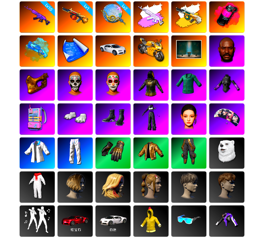 编号G6957皮肤:10级美杜莎762 1级弥诺陶洛斯AUG 2级塞壬平底锅 美杜莎(异色) 弥诺陶洛斯AUG(异色) 品红色烟雾弹 蓝色魔法迷雾-M79 张图纸 布加迪跑车 杜卡迪极速金 胜利密室 黑鬼 金面 亡灵律动妆容 万寿菊狂欢妆容 GPT夹克 活动绿东 发光手臂 电磁背包 白熊鞋 aespa女团 宁艺卓 星魂猛虎下山运动夹克 星魂猛虎下山运动裤 拉风龙 北极熊头套 北极熊连身衣 发型21 发型56 发型61 发型24 类星之王 青海摇 车漆 非鸡连帽卫衣 星魂猛虎下山滑雪镜 PNC 2025 战术科技上衣 PNC 2025 战术科技长裤 PNC 2025 战术科技运动鞋 丝滑夏日凉鞋 漫步沙滩凉鞋 日光下澈丛林短裤 日光下澈热带短裤 丝滑夏日短裤(白色) 丝滑夏日短裤(橄榄绿) 日光下澈丛林上衣 日光下澈热带上衣 丝滑夏日上衣(白色) 丝滑夏日上衣(橄榄绿) 漫步沙滩连衣裙(棕色) 漫步沙滩连衣裙(蓝色) 冬梦女孩 冰雪天使连衣裙 斑斓危机 闪亮运动裤 紫色运动裤 鳄鱼大军泳裤 战术科技裤 猎手猫夹克 特工小兔长裤 银河系女孩 冬梦女孩 冬梦女孩 冬梦女孩 冬梦女孩 星际小兔 塞壬的裙子 棉花糖手套 极光之友 极光之友 蓄势待发 蓄势待发 蓄势待发 蓄势待发 蓄势待发 柴犬帮 柴犬帮 宝贝外面冷 宝贝外面冷 兄弟同盟 怨恨小姐 怨恨小姐 怨恨小姐 棉花蕾丝绒 棉花蕾丝连衣裙 亮片炫彩长裤 奶牛印花绑结式上衣(黑色) 维寒迪雪上运动夹克 维寒迪长裤 老奶奶睡裤 圣诞之子夹克 圣诞之子长裤 头号主播 战术科技夹克 晚餐幻象纹身 蜘蛛纹身 金墨点染 金墨点染 金墨点染 群雄逐鹿 金墨点染 群雄逐鹿 群雄逐鹿 开拓者手套 强袭者夹克 小兔航天局 小兔航天局 小兔航天局 小兔航天局 小兔航天局 小兔学院 宁艺卓 7周年快乐! 月下狼嚎 大猫狂怒 亲爱的... 均衡器 迪斯科舞会 双狼成行 潜水教练 - 头盔(3级) 粉梦长眠 - 头盔(2级) 斑点狗 - 头盔(2级) PGC 战士阿冰 - 头盔(3级) 沙滩狂战士 - 头盔(3级) 芳心女猎手 - 头盔(3级) 太妃糖 - 头盔(3级) 游戏日 - 头盔(3级) 迪厅镜面球 - 头盔(3级) 赫尔墨斯之翼 - 头盔(3级) 8th Anniversary - Helmet (Level 3) “熊宝贝” - 头盔(3级) 繁星鹿角 - 头盔(3级) 塞壬背包 PNC 2025 战术科技背包(3级) 来自乐园的问候背包(3级) 小兔航空航天局背包(2级) 重返校园背包(2级) 包装狗狗背包(2级) 7周年快乐背包(3级) 一夜好眠背包(3级) 汪汪伙伴背包(3级) 包装狗狗背包(3级) 高科技时尚小兔背包(3级) 废土拾荒者背包(3级) PGC 2023 皇家风范降落伞 PNC 2023 降落伞 PGC 2021 降落伞 PCS1 降落伞 乐园的问候 赛季37竞技降落伞 马桶人降落伞 经典特工套装 雪国风光 - M416 花呢控 - Beryl M762 魔女之力 - Beryl M762 礼物环绕 - Beryl M762 多彩科技猫 - AUG 分形碎片 - ACE32 霓虹之星 - SCAR-L 亡灵之花 - SCAR-L 疯狂收割者 - SCAR-L 粗糙 (橙色) - SCAR-L 分形几何 - QBZ 不朽游行 - Mk47 Mutant 金色落叶 - Mk47 Mutant Blue Magic Blaster - G36C 分形几何 - G36C 山花烂漫 - Groza 镀金 - Groza 无拘来世 - K2 钴蓝呼号 - SLR 大理石宝藏 - SLR PGC 2022 王牌登场 - SLR 镀金 - SKS 彩虹之上 - Mini14 热浪 - Mk12 雪国风光 - Mk14 紫色雨滴 - VSS 斑点狗 - VSS 蟒蛇花园 - QBU 亡灵之花 - 德拉贡诺夫 魔女之力 - AWM 镀金 - AWM 幸运骑士 - M24 马桶人 - MP5K 疯狂收割者 - MP5K 竞速之道 - P90 Poof! - PP-19 Bizon 钴蓝呼号 - UMP 熔岩灯 - UMP 魔女之力 - Vector 渗透与破坏 - Vector 精工美术 - 汤姆逊冲锋枪 镀金 - Vector 锁链帮 - Micro UZI 三重彩 - Micro UZI 马桶人 - M249 花呢控 - M249 灰色系 - DBS [战场痕迹] 无信号 - S12K 抽象派 - S1897 灰色系 - S686 恶战 - P92 华夫饼 - R1895 愉悦的绿松色 - P1911 数码沙漠迷彩 - P18C PUBG信条钢管 马桶塞 山花烂漫 - 十字弩 海洋独行侠手套 7周年快乐手套 月之狂蜥的手套 幸运怪盗手套 准备就绪手套 零度机能风摩托车手手套 欧姆的手套 维寒迪雪上运动手套 骷髅脸特技手套 朱莉的手套 甜蜜梦境手套 PGC 2022 战术科技手套 PGC 2022 斑斓危机手套 狂人的手套 狂热追随者手套 万寿菊狂欢手套 亡灵律动手套 漫步沙滩手环 豹子精手饰 时光探员手套 革面悍匪手套 暗夜追踪者手套 沙滩宝贝智能眼镜 青花怒放太阳镜 PGC 2022 斑斓危机墨镜 暗影突袭者墨镜 猎手便装眼镜 日光下澈墨镜 PNC 2025 战术科技护目镜 雀斑妆容 PGC 2021 黑暗凝视妆容 喜极而泣眼影 绯红新星的妆容 女性面容17 女性面容21 女性面容10 女性面容8 狂人·马尔霍特拉 女性面容7 男性面容11 邓肯·斯莱德 男性面容18 男性面容16 男性面容8 狂热追随者妆容 漫步沙滩妆容 时光探员妆容 冬梦女孩妆容 发型16 发型11 发型54 发型12 发型65 发型37 绯红新星的发型 发型47 发型14 发型13 发型23 发型55 治安队发型 发型19 发型46 发型20 发型95 发型64 发型87 发型88 发型83 发型63 发型69 发型78 寒锋背包(3级) 战士阿冰背包(3级) 锦鲤随行背包(2级) 肆意挥洒背包(2级) 沙滩小径背包(2级) PCS2 弹药库背包(2级) 通缉者背包(2级) 马桶人背包(2级) 小熊觉醒背包(2级) 小兔快递背包(1级) 优雅夏日背包(1级) 柯基帮背包(1级) 勇往直前背包(1级) 原生黑暗背包(1级) 维寒迪雪上运动背包(1级) 破碎硬壳背包(1级) 光彩夺目皮革背包(1级) 独行侠背包(1级) 马桶人 - 头盔(3级) 金色头冠 - 头盔(3级) 噬命雏菊 - 头盔(2级) 呆萌咕噜眼 - 头盔(2级) 马桶人 - 头盔(2级) 专业守卫 - 头盔(2级) 死亡六进制 - 头盔(2级) PUBG信条 - 头盔(2级) 维寒迪雪上运动 - 头盔(1级) 高科技时尚小