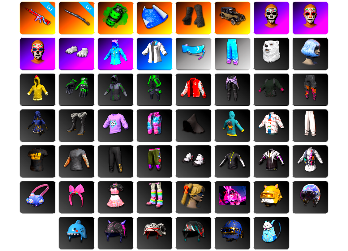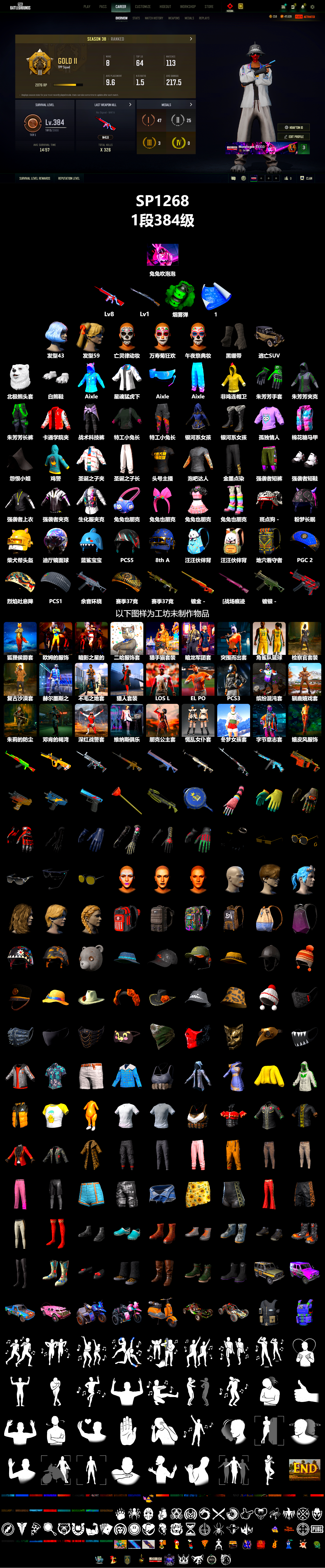 编号SP1268皮肤:8级无信号M4 1级猛虎98k 翡翠色烟雾弹 张图纸 黑绷带 逃亡SUV 亡灵律动妆容 万寿菊狂欢妆容 午夜祭典妆容 白熊鞋 小叮当 星魂猛虎下山运动夹克 Aixleft Aixleft 北极熊头套 发型43 非鸡连帽卫衣 朱芳芳手套 朱芳芳夹克 朱芳芳长裤 卡通学院夹克 战术科技裤 特工小兔长袖上衣 特工小兔长裤 银河系女孩 银河系女孩 孤独情人 棉花糖马甲 怨恨小姐 鸡警 圣诞之子夹克 圣诞之子长裤 头号主播 泡吧达人 金墨点染 强袭者短裤 强袭者短鞋 强袭者上衣 强袭者夹克 小兔学院 兔兔也朋克面罩 兔兔也朋克发箍 兔兔也朋克洋裙 兔兔也朋克腿套 发型59 兔兔吹泡泡 柴犬帮头盔(3级) 迪厅镜面球 - 头盔(1级) 蓝鲨宝宝 - 头盔(2级) 粉梦长眠 - 头盔(2级) 斑点狗 - 头盔(2级) PCS5 磨砂炮铜 - 头盔(2级) 8th Anniversary - Helmet (Level 3) 汪汪伙伴背包(1级) 汪汪伙伴背包(2级) 地穴看守者背包(3级) PGC 2023 皇家风范降落伞 烈焰吐息降落伞 PCS1 降落伞 赛季37竞技降落伞 狐狸侯爵套装 欧姆的服饰套装 暗影之星的服饰套装 二哈服饰套装 猎手猫套装 暗龙军团套装 突围而出套装 角鲨队篮球套装 检察官套装 复古沙漠套装 赫尔墨斯之翼套装 不毛之地套装 猎人套装 LOS LEONES 主场队服套装 EL POZO 主场队服套装 PCS3 服饰套装 缤纷混沌套装 驯鹿嬉戏套装 朱莉的防尘外套套装 邓肯的褐湾套装 深红战警套装 维纳斯俱乐部套装 朋克公主套装 慌乱女仆套装 冬梦女孩套装 字节意志套装 嬉皮风服饰套装 渗透与破坏 - AKM 金色续响 - AUG 亡灵之花 - SCAR-L 锁链帮 - M16A4 淡雅之力 - Mk47 Mutant 幸运骑士 - SKS 亡灵之花 - 德拉贡诺夫 赛季37竞技黄金 - Mk14 余音环绕 - UMP 镀金 - AWM [战场痕迹] 粉梦长眠 - M24 马桶人 - MP5K 镀银 - UMP 拼图 - 汤姆逊冲锋枪 地狱火 - Vector 锁链帮 - Micro UZI 钴蓝呼号 - Micro UZI 钴蓝呼号 - P18C 马桶塞 都市猎手 - 十字弩 8th Anniversary - Pan 兔兔也朋克手套 工人手套(黄色) 队长的迷彩手套 准备就绪手套 怪盗小兔手套 雪片手套 午夜祭典手套 万寿菊狂欢手套 亡灵律动手套 豹子精手饰 使徒墨镜 优雅夏日眼镜 死亡六进制太阳镜 沙滩宝贝智能眼镜 老式太阳镜 美人鱼妆容 哥特孩童妆容 夏日之星妆容 小胡子 发型14 美人鱼发型 发型45 发型50 发型83 海湾救生员背包(3级) 生存专家背包(3级) 恐龙地带背包(3级) 沙漠骗徒背包(2级) 沙滩风情背包(1级) 朱莉的潜行者背包(1级) 噬命雏菊 - 头盔(2级) PUBG信条 - 头盔(2级) “熊宝贝”头套 夏日渔夫帽(蓝绿色) 准备就绪鸭舌帽 队长的迷彩鸭舌帽 渔夫帽 骑师帽 甜蜜宣言针织帽 玩具兵帽 太阳花瓣草帽 午夜祭典帽子 万寿菊狂欢发带 亡灵律动帽子 露鳍鲨鱼渔夫帽 豹子精渔夫帽 圣诞之子针织帽 准备就绪口罩 危险勿近面罩 月之影面罩 胜利收割者面具 卡通袭击者眼罩 队长的迷彩面巾 猩红猎手面具 豹子精面具 黄铜鸟嘴医生面具 准备就绪夹克 花衬衫(蓝绿色) 夏日短裤(灰色) 海洋小姐上衣 月之影背心 月之影风衣 龙之女皇服饰 小小鸡仔外套 生存练习生连帽卫衣 PUBG信条马甲 小小鸡仔T恤 无头火鸡充气式连身衣 T 恤 (白色) T 恤 (灰色) 金色守护者上衣 午夜祭典上衣 亡灵律动衬衫 豹子精上衣 黄铜鸟嘴医生夹克 亡灵律动夹克 豹子精夹克 准备就绪长裤 月之影机能风长裤 告白的运动长裤 唯一的爱长裤 战斗裤 (棕色) 战斗裤 (卡其色) 疯狂科学长裤 短裤配紧身裤(黑色) 小小鸡仔短裤 超级士兵迷彩短裤 沙滩宝贝短裤 夏日向日葵短裙 午夜祭典短裤 亡灵律动长裤 豹子精短裤 黄铜鸟嘴医生裤 万寿菊狂欢长靴 月之影机能风运动鞋 沙滩鞋(蓝绿色) 邓肯的靴子 准备就绪运动鞋 高帮运动鞋 霓虹纹饰运动鞋 绯红新星的短靴 丝袜与校园风鞋子(黑色) 午夜祭典短靴 亡灵律动皮鞋 豹子精便鞋 黄铜鸟嘴医生靴 圣诞之子短靴 暗影突袭者短靴 “专业守卫” 乌阿斯吉普车 “间谍软件” 乌阿斯吉普车 “像素风大冒险” 罗尼 “魔力甜心萨莉” 两栖装甲车 “加塔尔越野赛”摩托车 “怪盗小兔” 摩托车 “小兔快递配送员” 小型摩托车 “银河小队漫游者” 双人越野车 “PCS2 战术扭矩” 双人越野车 专业守卫防弹衣(2级) 海岸突击队防弹衣(3级) 胜利之舞159 胜利之舞40 胜利之舞108 胜利之舞144 胜利之舞145 胜利之舞142 胜利之舞135 Victory Dance - 8th Anniversary 我 心 你 达阵! 优雅鞠躬 胜利之舞6 #1 胜利之舞13 特殊问候 胜利之舞26 嫉妒 棒棒哒 投降 不耐烦 谢谢 停止! 抖缩 庆祝 同意 大厅姿势3 反对 你好 大厅姿势2 大厅姿势1 你完蛋了 耸肩 过来 大厅姿势4 功夫大师 落幕 生存等级:1段