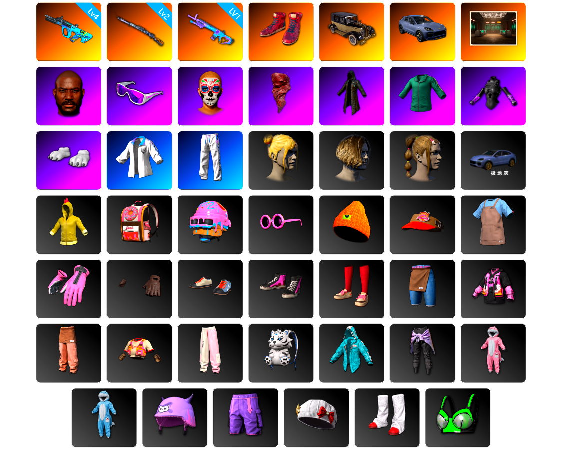 [PZ2064]4级GD-AUG 2级猛虎98k 1级魔咒之力Mk12 柏林鞋 保时捷卡宴 交易所接待室 黑鬼 滑雪镜 红面巾 黑大衣 活动绿东 发光手臂 白熊鞋 丸子头 滑雪帽