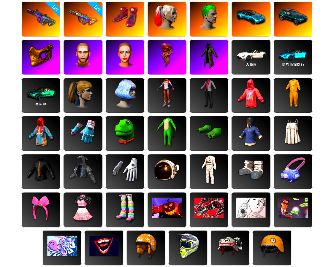 编号PZ2540皮肤:1级霓虹AUG 1级爆裂AUG 柏林鞋 小丑女 小丑男 马丁敞篷跑车 马丁SUV 金面 丑男妆容 丑女妆容 红面巾 黑大衣 车漆 DBX707 车漆(阿斯顿·马丁赛车绿) 小马尾 发型43 哈莉·奎茵「老爸的小怪物」服饰 小丑夜总会服饰 3周年纪念连帽卫衣 小可爱睡衣 圣诞老人 棉花糖手套 恐龙乐园 恐龙乐园 恐龙乐园 帝王蝶卫衣 老奶奶睡裙 金墨点染 小兔航天局 小兔航天局 探月者 探月者 探月者 兔兔也朋克面罩 兔兔也朋克发箍 兔兔也朋克洋裙 兔兔也朋克腿套 万圣之夜 战场恶犬 手绘的“举起手来” 把钱交出来 花开 恶魔的微笑 柯基帮头盔(1级) PCS6 浓墨重彩车手 - 头盔(1级) 斑点狗 - 头盔(2级) 恐龙儿 - 头盔(2级) 林德仪式头盔(1级) 突围而出背包(1级) 彩色标记降落伞 阿斯顿·马丁降落伞 赛季29竞技降落伞 赛季25竞技降落伞 赛季23竞技降落伞 3周年纪念降落伞 紫气东来 GodV的M416 3周年纪念 - M416 地狱火 - M416 [战场痕迹] 快乐星期天 - M416 彩糖蛋糕 - M416 魔女之力 - Beryl M762 梅花同花 - Beryl M762 毒性 - Beryl M762 [战场痕迹] 危险玩偶屋 - Beryl M762 带刺之美 - AKM 银河武装 - AKM 钞能力 - AKM 蟒蛇之吻 - AKM 彩糖蛋糕 - AUG 多彩科技猫 - AUG 钞能力 - ACE32 第一年纪念 - SCAR-L 孟加拉刀 - SCAR-L 游猎之旅 - M16A4 甜蜜外衣 - M16A4 不朽游行 - Mk47 Mutant 奥丁的先锋 - Mk47 Mutant 双色 - Mk47 Mutant 这不是玩具 - Mk47 Mutant 复古摇滚 - Mk47 Mutant 丛林潜行者 - G36C 公路战士 - G36C 无尽迷宫 - Groza 山花烂漫 - Groza 钴蓝呼号 - K2 淬火真金 - K2 钴蓝呼号 - SLR [战场痕迹] 逆潮 - SLR [战场痕迹] 逆潮 - SKS 红桃同花 - Mk12 花呢控 - VSS 专业守卫 - AWM 鲜花之力 - AWM 劫掠者 - M24 双色 - 莫辛纳甘步枪 圆点猎手 - 莫辛纳甘步枪 凯尔特结 - MP5K 游猎之旅 - UMP 礼品店 - UMP 回收再利用 - 汤姆逊冲锋枪 公路战士 - 汤姆逊冲锋枪 银河武装 - MP9 抽象派 - MP9 复古摇滚 - Vector 指绘 - Micro UZI 钴蓝呼号 - Micro UZI 锁链帮 - Micro UZI 回收再利用 - DP-28 游猎之旅 - DP-28 凯尔特结 - DBS 都市猎手 - 锯短型霰弹枪 无尽迷宫 - S12K 这不是玩具 - S1897 抽象派 - S1897 灵长类 - S1897 雕刻的S686 公路战士 - P92 礼品店 - 沙漠之鹰 雕刻的R45 行动时刻 - P18C 哈莉·奎茵‘晚安’棒球棒 朋克战斧 回收再利用 - 十字弩 礼品店 - 十字弩 历久弥新 - 平底锅 神秘危险品手套 赛博小兔手套 兔兔也朋克手套 队长的迷彩手套 战场老兵手套 幸运怪盗手套 准备就绪手套 春之月夜手套 铁血警官的手套 秉烛罪人手套 蓝仙女手套 珍珠缀饰真丝手套 侦探眼镜 金色飞行员眼镜 优雅夏日太阳镜 哥特孩童妆容 女性面容22 女性面容12 男性面容12 男性面容8 复古侧分波浪卷 发型18 传统韩式盘发 发型42 发型17 钞能力背包(3级) 寒锋背包(3级) 坚持到底背包(3级) 无处可躲背包(2级) 恐龙乐园 LOGO 背包(2级) 一夜好眠背包(2级) 原生黑暗背包(1级) 沙滩风情背包(1级) 柯基帮头盔(3级) 通缉者 - 头盔(3级) 都市丛林 - 头盔(3级) 沙尘暗影 - 头盔(2级) 柯基帮头盔(2级) PCS7 - 头盔(2级) 专业守卫 - 头盔(2级) 石器时代 - 头盔(2级) 恐龙乐园员工 - 头盔(1级) 扫雷 - 头盔(1级) 没错我有罪头套 丝袜头套 突围而出头套 大檐遮阳帽 神枪手正装帽 冒险家帽子 老奶奶的睡帽 机长帽 蓝仙女帽 虎纹头巾 小飞鸡脖枕 准备就绪口罩 铁血警官的面罩 破碎的恶鬼面具 幸运怪盗面具 劫掠者面具 B-3 轰炸机夹克 准备就绪夹克 我的闪耀时刻连帽夹克 PCS7 连帽卫衣 烤鸡节吊带上衣 天空队长夹克 澄澈日光运动夹克 战场老兵夹克 没错我有罪上衣 神枪手正装夹克 夏日比基尼(黑色) 豹纹背心 夏日烈阳背心 春之月夜夹克 尽染樱色女款校服 大麻烦胸衣 小小鸡仔外套 萨诺生存者T恤 铁血警官的制服 突围而出上衣 亚麻唐装 机长制服衬衫 探险家大衣 冰霜公主上衣 温泉浴袍 衬衫 (灰色) 劫掠者洋裙 侦探上衣 阳光普照T恤 小小鸡仔T恤 传奇高手球衣 蓝仙女洋裙 神秘危险品连身衣 马先生的装束 角鲨队吉祥物玩偶服 T 恤 (白色) 先驱者衬衫 棕熊猎人外套 T 恤 (灰色) 神枪手正装衬衫和马甲 速度与愤怒上衣 烤鸡节紧身裤 准备就绪长裤 没错我有罪丝袜配短靴 沙漠之花牛仔裤 神枪手正装裤 机长制服西裤 探险家短裤 恐龙乐园紧身裤 侦探长裤 迷雾追踪者短裤 战斗裤 (棕色) 战斗裤 (卡其色) 牛仔裤 (棕褐色) 小小鸡仔短裤 铁血警官的短裙 拉拉队裙子 夏日向日葵短裙 我的闪耀时刻短裙 春之月夜短裙 机长制服便鞋 传奇队篮球鞋 春之月夜便鞋 准备就绪运动鞋 高帮运动鞋 夏日烈阳凉鞋 迷雾追踪者运动鞋 骑师长靴 朱莉的靴子 神枪手正装靴 神秘危险品短靴 保暖作战靴 皮靴 我的闪耀时刻网袜配短靴 尽染樱色皮鞋配长袜 铁血警官的长靴 劫掠者长靴 “专业守卫” 乌阿斯吉普车 “公路战士” 恣马 “彩色标记” 达西亚轿车 “恐龙乐园” 达西亚轿车 专业守卫防弹衣(2级) 洒洒水啦 胜利之舞109 胜利之舞120 让我听到你们的声音! 耶! 一脚踢飞 按个门铃 可爱的屈膝礼 跪地求饶 掷硬币 胜利之舞19 #1 胜利之舞15 嫉妒 棒棒哒 挑衅 投降 不耐烦 谢谢 停止! 抖缩 庆祝 哭 踢 笑 愤怒 同意 大厅姿势5 大厅姿势6 大厅姿势3 反对 你好 大厅姿势2 大厅姿势1 你完蛋了 耸肩 过来 鼓掌 大厅姿势4 花样滑冰运动员 生存等级:2段