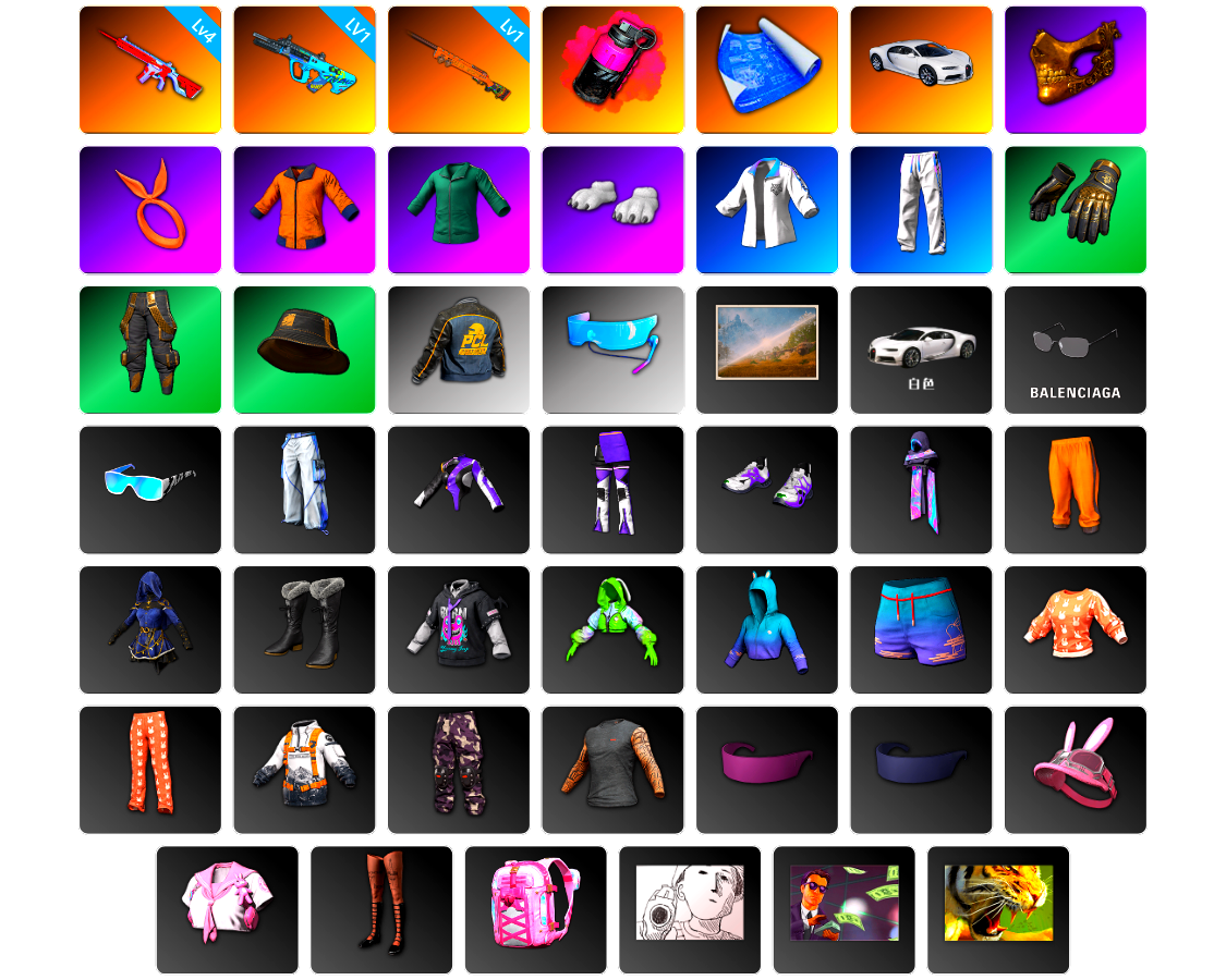 编号PZ2683皮肤:4级无信号M4 1级GD-AUG 1级夜曲M24 品红色烟雾弹 张图纸 布加迪跑车 金面 橙色发带 黄东 活动绿东 白熊鞋 星魂猛虎下山运动夹克 星魂猛虎下山运动裤 拉风龙 PCL夹克 Aixleft 零度计划 车漆 巴黎世家透明方形墨镜 星魂猛虎下山滑雪镜 星魂虎耀星辉工装裤 PNC 2025 战术科技上衣 PNC 2025 战术科技长裤 PNC 2025 战术科技运动鞋 斑斓危机 工作裤 银河系女孩 银河系女孩 孤独情人 星际小兔 极光之友 极光之友 兔兔长袖运动衫 兔兔运动裤 维寒迪雪上运动夹克 维寒迪长裤 OGBG 纹身 小兔航天局 小兔航天局 小兔学院 哥特长靴 曼迪3级包 手绘的“举起手来” 把钱交出来 猛虎 游戏结束 双狼成行 PNC 2025 015 - 头盔(3级) 胡椒薄荷 - 头盔(1级) Carbon Fiber Commando - Helmet (Level 2) 夹心软糖 - 头盔(2级) “熊宝贝” - 头盔(3级) PNC 2025 战术科技背包(3级) 皇冠宝石 PGC 2023 皇家风范降落伞 泰索尼克降落伞 柠檬汁 - M416 PGC 2023 皇冠宝石 - Beryl M762 破冰者 - Beryl M762 [战场痕迹] 湮灭 - Beryl M762 PCS2 金色成就 - Beryl M762 Winter Reign - AKM 渗透与破坏 - AKM 金色续响 - AUG 远程地图 - AUG 疯狂收割者 - SCAR-L 甜蜜外衣 - M16A4 游猎之旅 - M16A4 [战场痕迹] 朱雀之灵 - M16A4 数码丛林迷彩 - M16A4 鎏金王朝 - QBZ 不朽游行 - Mk47 Mutant 无尽迷宫 - Mk47 Mutant 丛林潜行者 - G36C 山花烂漫 - Groza 钴蓝呼号 - K2 无慈悲 - K2 雪花 - K2 PGC 2022 王牌登场 - SLR [战场痕迹] PNC 2025 战术科技 - SKS 孤独情人 - Mk12 孙悟空 - Mk14 斑点狗 - VSS 璀璨星光 - QBU 余音环绕 - 十字弩 [战场痕迹] PNC 2025 战术科技 - MP5K 唐三藏 - FAMAS 沙悟净 - P90 方形铬印 - PP-19 Bizon 破冰者 - UMP 雪国风光 - 汤姆逊冲锋枪 镀银 - 汤姆逊冲锋枪 鲜花之力 - Vector 海狼鱼 - Vector 锁链帮 - Micro UZI 数码沙漠迷彩 - Micro UZI 爬行者之印 - M249 花呢控 - M249 三重条纹 - DP-28 双色 - DBS 丛林潜行者 - 锯短型霰弹枪 镀银 - S12K 钴蓝呼号 - S1897 镀银 - S1897 Winter Reign - S686 波涛荡漾 - S686 丛林潜行者 - P92 数码沙漠迷彩 - P92 沙漠烈阳 - 沙漠之鹰 水手 - R1895 数码沙漠迷彩 - P18C 陶土质感大砍刀 PUBG信条钢管 鬼魅终曲吉他 黑色金属 - 平底锅 粉红正义 - 铁拳火箭筒 不朽游行 - 铁拳火箭筒 沙滩宝贝美甲配手环 小兔学院水手服手套 队长的迷彩手套 准备就绪手套 维寒迪雪上运动手套 金底耐磨手套 PNC 2025 战术科技护目镜 女性面容8 女性面容19 发型44 发型66 发型13 发型45 发型88 寒锋背包(3级) 艾伦格零度计划背包(3级) 沙滩小径背包(2级) PCS2 弹药库背包(2级) 青花怒放背包(2级) 春之祥龙背包(1级) 勇往直前背包(1级) 维寒迪雪上运动背包(1级) 独行侠背包(1级) 战术骑手背包(1级) 小兔航空航天局 - 头盔(2级) PUBG信条 - 头盔(2级) 维寒迪雪上运动 - 头盔(1级) 雪人头套 夏日渔夫帽(蓝绿色) 队长的迷彩鸭舌帽 卡通袭击者针织帽 小兔快递制服鸭舌帽 准备就绪口罩 PGC 2023 帝皇的荆棘面具 卡通袭击者眼罩 队长的迷彩面巾 美美的睡眠眼罩 冰魇口罩 沙暴伪装丝巾 Carbon Fiber Commando Face Mask 炫酷反光夹克 水色突击夹克 类星之王的背心 雪人玩偶服 花衬衫(蓝绿色) 夏日短裤(灰色) 朱莉的褐湾制服 红绒预备生外套 小小鸡仔外套 迷雾追踪者上衣 生存练习生连帽卫衣 小兔快递制服上衣 紧身连衣裙(红色) 卡通袭击者上衣 PUBG信条马甲 热情高领毛衣 (白色) 美美的长袖睡衣 小小鸡仔T恤 雨中漫步夹克 雪地迷彩夹克 PNC 2025 夹克 准备就绪长裤 水色突击长裤 高档西裤 卡通袭击者牛仔裤 美美的睡裤 疯狂科学长裤 小小鸡仔短裤 预备生短裙 小兔快递制服短裙 坏蛋小蜜蜂长裤 雪地工装裤 懒人鞋(灰色) 美美的卧室拖鞋 兔兔运动鞋 沙滩鞋(蓝绿色) 雪人短靴 维寒迪雪上运动短靴 准备就绪运动鞋 卡通袭击者步鞋 萌虎下山帆布鞋 绯红新星的短靴 预备生丝袜配高跟鞋 小兔快递仓管长袜 雪地迷彩短靴 PNC 2024 短靴 蓝鲨宝宝睡拖 “双龙会” 摩托车 “逐梦者” 摩托车 “8号赛手” 摩托艇 胜利之舞142 Victory Dance - 8th Anniversary 胜利之舞136 胜利之舞35 #1 特殊问候 胜利之舞10 嫉妒 棒棒哒 挑衅 投降 不耐烦 谢谢 停止! 抖缩 庆祝 哭 踢 笑 愤怒 同意 反对 你好 大厅姿势2 大厅姿势1 你完蛋了 耸肩 过来 鼓掌 胜利之舞162 胜利之舞163 雪舞登场 胜利之舞—星魂电摇 巴黎世家:爱意满满 巴黎世家 - 爱意满满 海鸥的小酌 维寒迪的小鸟 祝你好运 光芒闪耀 生存等级:1段