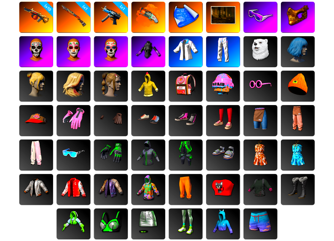 编号LCX17皮肤:10级弥诺陶洛斯AUG 1级烈日灼烧-S1897 1级寒蚀MP5K 橙色狂怒之雾-M79 张图纸 艾伦格重制 滑雪镜 金面 亡灵律动妆容 万寿菊狂欢妆容 午夜祭典妆容 发光手臂 星魂猛虎下山运动夹克 星魂猛虎下山运动裤 北极熊头套 发型68 丸子头 发型56 发型61 非鸡连帽卫衣 唯一甜甜圈背包(3级) 果酱甜甜圈 - 头盔(3级) 暴躁花生墨镜 暴躁花生针织帽 甜甜圈遮阳帽 釉彩甜甜圈手套 甜甜圈手套 釉彩甜甜圈运动鞋 暴躁花生运动鞋 甜甜圈运动鞋 甜甜圈短裤 暴躁花生长裤 釉彩甜甜圈运动裤 星魂猛虎下山滑雪镜 朱芳芳手套 朱芳芳夹克 朱芳芳长裤 漫步沙滩凉鞋 漫步沙滩连衣裙(棕色) 漫步沙滩连衣裙(蓝色) 银色美人飞行员夹克 卡通学院夹克 零度机能风 加油!连帽卫衣 工作裤 猎手猫上衣 特工小兔长袖上衣 银河系女孩 星际小兔 星际小兔 星际小兔 星际小兔 极光之友 极光之友 柴犬帮 宝贝外面冷 维娜托手套 维娜托口罩 维娜托短裙 佣兵队制服 佣兵队长裤 维寒迪雪上运动夹克 维寒迪长裤 先驱战队 先驱战队 先驱战队 先驱战队 先驱战队 先驱战队 先驱战队 先驱战队 先驱战队 先驱战队 圣诞之子长裤 薄荷巧克力 头号主播 OGBG 纹身 金墨点染 开拓者墨镜 开拓者手套 强袭者短裤 萨莉的礼服 萨莉2级头 哥特上衣 发型60 回归 让子弹飞 朱莉 女巫的黑暗仪式 游戏结束 双狼成行 PCS5 磨砂炮铜 - 头盔(2级) 林德仪式头盔(1级) 金色象征 - 头盔(3级) 芳心女猎手 - 头盔(3级) 游戏日 - 头盔(3级) 赫尔墨斯之翼 - 头盔(3级) 8th Anniversary - Helmet (Level 3) “熊宝贝” - 头盔(3级) PCS6 浓墨重彩背包(1级) 粉彩哥特背包(2级) 紫色棱镜背包(3级) 一夜好眠背包(3级) 芳心女猎手背包(3级) PGC 2023 皇冠宝石背包(3级) 甜甜圈之家降落伞 PGC 2022 降落伞 踏浪而行降落伞 魔力甜心萨莉的降落伞 PGC 2021 降落伞 银兔猎手降落伞 马桶人降落伞 历战骑士服饰套装 蟒蛇吐信套装 雪片套装 柠檬汁 - M416 糖霜乐园 - M416 PGC 2022 王牌登场 - Beryl M762 金色续响 - AUG 糖果碗 - ACE32 亡灵之花 - SCAR-L 三重彩 - SCAR-L 镀金 - Groza 钴蓝呼号 - SLR 糖霜乐园 - SKS 礼品店 - SKS 雪国风光 - Mk14 孙悟空 - Mk14 标准猎手 - VSS 魔力甜心萨莉的永恒挚友 - 德拉贡诺夫 镀金 - Win94 PNC 2023 完美角度 - Kar98k 镀金 - AWM 马桶人 - MP5K 疯狂收割者 - MP5K 唐三藏 - FAMAS 竞速之道 - P90 彩虹之上 - UMP 竞速之道 - UMP 愉悦的绿松色 - 汤姆逊冲锋枪 心跳掠夺者 - MP9 镀金 - Vector 锁链帮 - Micro UZI 马桶人 - M249 科技金属 - DBS 镀银 - S12K 抽象派 - S1897 华夫饼 - S686 礼品店 - S686 黑色金属 - 平底锅 8th Anniversary - Pan 维纳斯俱乐部手部装饰 佣兵队手套 队长的迷彩手套 准备就绪手套 海军军官制服手套 维寒迪雪上运动手套 PGC 2022 战术科技手套 午夜祭典手套 万寿菊狂欢手套 亡灵律动手套 都市耀光戒指 漫步沙滩手环 暗夜追踪者手套 PGC 2019 护手和智能手表 百叶窗太阳镜(银色) 飞行员太阳镜(暗红色) 炫酷蓝色墨镜 暗影突袭者墨镜 都市耀光墨镜 维纳斯面部妆容 女性面容10 女性面容20 女性面容16 冬眠后的胡子 漫步沙滩妆容 发型23 发型30 发型55 发型26 发型63 发型93 发型83 发型73 钞能力背包(3级) 寒锋背包(3级) 小小捣蛋鬼背包(3级) 恐龙地带背包(3级) 狮鹫传说背包(2级) 灰色星期一背包(2级) VTR 活跃者背包(2级) 陈旧皮革背包(2级) 彩绘祭坛背包(2级) 马桶人背包(2级) 维寒迪雪上运动背包(1级) 马桶人 - 头盔(3级) 都市丛林 - 头盔(3级) 马桶人 - 头盔(2级) 噬命雏菊 - 头盔(2级) 零度机能风车手 - 头盔(2级) 专业守卫 - 头盔(2级) 柯基帮头盔(2级) 维寒迪雪上运动 - 头盔(1级) 恐龙乐园 “卡蜜” 面具 丝袜头套 准备就绪鸭舌帽 队长的迷彩鸭舌帽 雪色美人帽 午夜祭典帽子 特种女电视人头套 1000 SPF 防晒帽 准备就绪口罩 暗影之星的面巾 队长的迷彩面巾 PGC 2022 战术科技面罩 圣诞快乐围巾 沙暴伪装丝巾 黄铜鸟嘴医生面具 Carbon Fiber Commando Face Mask 沙漠居民面巾 荣都华彩上衣 咆哮之力街头风背心 皇室上衣 时尚牛仔夹克 赫尔墨斯之翼夹克 荒地皮马甲 橙汁上衣 小小鸡仔外套 PNC 2022 连战连捷夹克 'The Last' 运动背心 远足者外套式衬衫 下次好运衬衫 鸡宝宝 快枪手上衣 正装衬衫配领带(蓝色) 烤鸡节第三只眼T恤 圣诞风针织毛衣 节日之家毛衣 大灰狼的帽衫 PGC 2019 战术连帽卫衣 拉拉队上衣 小小鸡仔T恤 钞能力西装 治安队连身衣 欧姆的连身衣 T 恤 (白色) 专业守卫制服 T 恤 (灰色) 极限追逐者夹克 恐龙乐园 LOGO T恤 Horse King的老虎T恤 雨中漫步夹克 迷雾追踪者夹克 特种女电视人夹克 亡灵律动衬衫 都市耀光夹克 暗影突袭者夹克 赫尔墨斯之翼长裤 骑师长裤 PNC 2022 连战连捷长裤 准备就绪长裤 咆哮之力街头风运动裤 沙漠之花牛仔裤 字节意志紧身裤 海军军官长裤 战斗裤 (棕色) 战斗裤 (卡其色) 圣诞派对长裤 侠盗猫短裤 橙汁短裤 小小鸡仔短裤 大灰狼的牛仔裤 朱莉的潜行者短裤 拉拉队条纹短裙 极限追逐者短裤 海军军官短裙 午夜祭典短裤 特种女电视人紧身裤 亡灵律动长裤 都市耀光宽松长裤 黄铜鸟嘴医生裤 万寿菊狂欢长靴 芳心女猎手短裙 暗影突袭者长裤 Horse King的老虎短裤 守墓者皮鞋 咆哮之力街头风便鞋 拉拉队球鞋 先驱战队战靴 赫尔墨斯之翼运动鞋 佣兵队运动鞋 PNC 2022 连战连捷短靴 维寒迪雪上运动短靴 准备就绪运动鞋 高帮运动鞋 雪中漫步