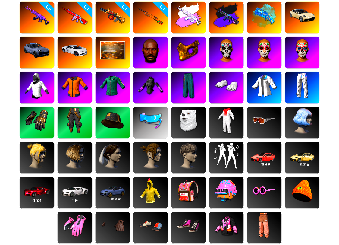 编号T13519皮肤:9级美杜莎762 1级无信号M4 1级弥诺陶洛斯AUG 1级夜曲M24 美杜莎(异色) 无信号M4(异色) 蓝色魔法迷雾-M79 帕拉梅拉 保时捷卡宴 布加迪跑车 陈列室 黑鬼 金面 亡灵律动妆容 万寿菊狂欢妆容 午夜祭典妆容 白战神 黄东 活动绿东 发光手臂 萨芬裤 白熊鞋 星魂猛虎下山运动夹克 星魂猛虎下山运动裤 拉风龙 Aixleft 北极熊头套 北极熊连身衣 Number 发型43 丸子头 发型21 萨迪娅的头纱 脏辫 发型24 青海摇 Panamera Turbo S Paint (Rose Gold Chrome) Panamera Turbo S Paint (Eggshell) 车漆 Cayenne Turbo GT Paint (Arctic Grey) 非鸡连帽卫衣 唯一甜甜圈背包(3级) 果酱甜甜圈 - 头盔(3级) 暴躁花生墨镜 暴躁花生针织帽 釉彩甜甜圈手套 甜甜圈手套 釉彩甜甜圈运动鞋 暴躁花生运动鞋 暴躁花生连帽卫衣 暴躁花生长裤 甜甜圈上衣 釉彩甜甜圈运动裤 星魂猛虎下山滑雪镜 朱芳芳手套 朱芳芳夹克 朱芳芳长裤 PNC 2025 全力出击长裤 PNC 2025 战术科技运动鞋 PNC 2025 全力出击运动鞋 丝滑夏日凉鞋 漫步沙滩凉鞋 日光下澈丛林短裤 丝滑夏日短裤(白色) 丝滑夏日短裤(橄榄绿) 丝滑夏日上衣(白色) 卡通学院夹克 零度机能风 加油!连帽卫衣 闪亮运动裤 紫色运动裤 工作裤 三色猫连身衣 特工小兔长袖上衣 特工小兔长裤 小队队长 银河系女孩 银河系女孩 星际小兔 绒毛伙伴 绒毛伙伴 绒毛伙伴 棉花糖帽子 棉花糖马甲 极光之友 极光之友 恐龙乐园 恐龙乐园 柴犬帮 柴犬帮 维娜托手套 维娜托口罩 缤纷混沌连帽卫衣 棉花蕾丝绒 棉花蕾丝连衣裙 紫喵喵手套 紫喵喵卫衣 紫喵喵短靴 亮片炫彩 亮片炫彩长裤 维寒迪雪上运动夹克 维寒迪长裤 老奶奶睡裙 老奶奶睡裤 先驱战队 先驱战队 先驱战队 先驱战队 先驱战队 先驱战队 先驱战队 先驱战队 先驱战队 先驱战队 鸡警短裤 沉睡女王 沉睡女王 绸缎长袖 绸缎睡裤 头号主播 太阳之子电波干扰背包 晚餐幻象纹身 金墨点染 金墨点染 金墨点染 群雄逐鹿 金墨点染 群雄逐鹿 开拓者墨镜 开拓者手套 开拓者上衣 开拓者夹克 开拓者短鞋 小兔航天局 小兔航天局 小兔航天局 小兔航天局 小兔航天局 小兔学院 兔兔也朋克发箍 兔兔也朋克腿套 哥特短裙 敏蒂的发箍 发型60 7周年快乐! 万圣节大奖 月下狼嚎 战场恶犬 亲爱的... 疯狂科学:狂热 双狼成行 潜水教练 - 头盔(3级) 柴犬帮头盔(2级) 糖果突击 - 头盔(1级) Carbon Fiber Commando - Helmet (Level 2) Vikendi Varsity - Helmet (Level 2) 奶牛印花 - 头盔(2级) 2级头 金色象征 - 头盔(3级) 三级头 8th Anniversary - Helmet (Level 3) 炼狱之角 “熊宝贝” - 头盔(3级) PNC 2025 战术科技背包(3级) 来自乐园的问候背包(3级) 包装狗狗背包(1级) 柴犬帮背包(2级) 2级包 包装狗狗背包(2级) 7周年快乐背包(3级) 包装狗狗背包(3级) 炼狱之角背包(2级) 甜甜圈之家降落伞 Vikendi Varsity Parachute 冬雪欲来降落伞 无重力降落伞 挣脱尘网降落伞 天空奥德赛 蒸汽之翼降落伞 妖魔横行降落伞 乐园的问候 布加迪降落伞 太阳之子降落伞 马桶人降落伞 小兔学院生化服套装 牛年服饰套装 1 角鲨队篮球套装 特工小兔套装 绯红新星套装 胜利收割者套装 卡拉金退休者套装 零度机能风套装 寄情尼罗河套装 晚秋-M416 霓虹之星 - SCAR-L [战场痕迹] 猩红时刻 - M16A4 金色落叶 - Mk47 Mutant 钴蓝呼号 - G36C 山花烂漫 - Groza 无慈悲 - K2 [战场痕迹] 漫彩四溢 - SKS 热浪 - Mk12 雪国风光 - Mk14 爬行者之印 - VSS 蟒蛇花园 - QBU 亡灵之花 - 德拉贡诺夫 彩糖蛋糕 - 莫辛纳甘步枪 竞速之道 - P90 方形铬印 - PP-19 Bizon 竞速之道 - UMP 翡翠之刃 - Vector 精工美术 - 汤姆逊冲锋枪 三重彩 - Micro UZI [战场痕迹] 无重力 - M249 无拘来世 - DP-28 科技金属 - DBS 波涛荡漾 - S12K 这不是玩具 - S1897 华夫饼 - S686 丛林潜行者 - P92 水手 - R1895 沙漠烈阳 - P1911 圣诞之力 - P18C PUBG信条钢管 马桶塞 妖魔大砍刀 不朽游行 - 铁拳火箭筒 山花烂漫 - 十字弩 碎瓜者 - 平底锅 8th Anniversary - Pan 午餐肉的护手绷带 7周年快乐手套 维纳斯俱乐部手部装饰 兔兔也朋克手套 人类猎手探险手套 队长的迷彩手套 准备就绪手套 维寒迪雪上运动手套 骷髅脸特技手套 朱莉的手套 PGC 2022 战术科技手套 霓虹纹饰手套 无重力中型手套 亡灵律动手套 万寿菊狂欢手套 午夜祭典手套 都市耀光戒指 狂野姿态手镯套组 漫步沙滩手环 PNC 2025 全力出击手套 时光探员手套 革面悍匪手套 芳心女猎手手套 金底耐磨手套 PGC 2019 护手和智能手表 卡通学院眼镜 超级士兵墨镜 使徒墨镜 女明星眼镜(黑色) 乔纳森的猎人墨镜 都市耀光墨镜 PNC 2025 战术科技护目镜 维纳斯面部妆容 哥特孩童妆容 雀斑妆容 匕首纹饰加红晕妆容 萨迪娅·库雷希 女性面容21 女性面容11 女性面容20 女性面容16 女性面容7 午餐肉 邓肯·斯莱德 男性面容13 漫步沙滩妆容 时光探员妆容 Gameday Makeup 无重力妆容 发型11 发型44 发型39 发型67 发型66 发型65 发型37 发型32 发型30 发型55 发型26 发型20 发型93 发型91 发型89 发型88 发型87 发型63 发型85 发型83 发型78 Hairstyle 81 恐龙地带背包(3级) PCS2 弹药库背包(2级) 末日烙印背包(2级) 彩绘祭坛背包(2级) 马桶人背包(2级) Vikendi Varsity Backpack (Level 2) 勇往直前背包(1级) 维寒迪雪上运动背包(1级) 太阳之子 - 头盔(2级) 马桶人 - 头盔(3级) 噬命雏菊 - 头盔(2级) 马桶人 - 头盔(2级) PUBG信条 - 头盔(2级) 一帆风顺 - 头盔(2级) 维寒迪雪上运动 - 头盔(1级) 扫雷 - 头盔(1