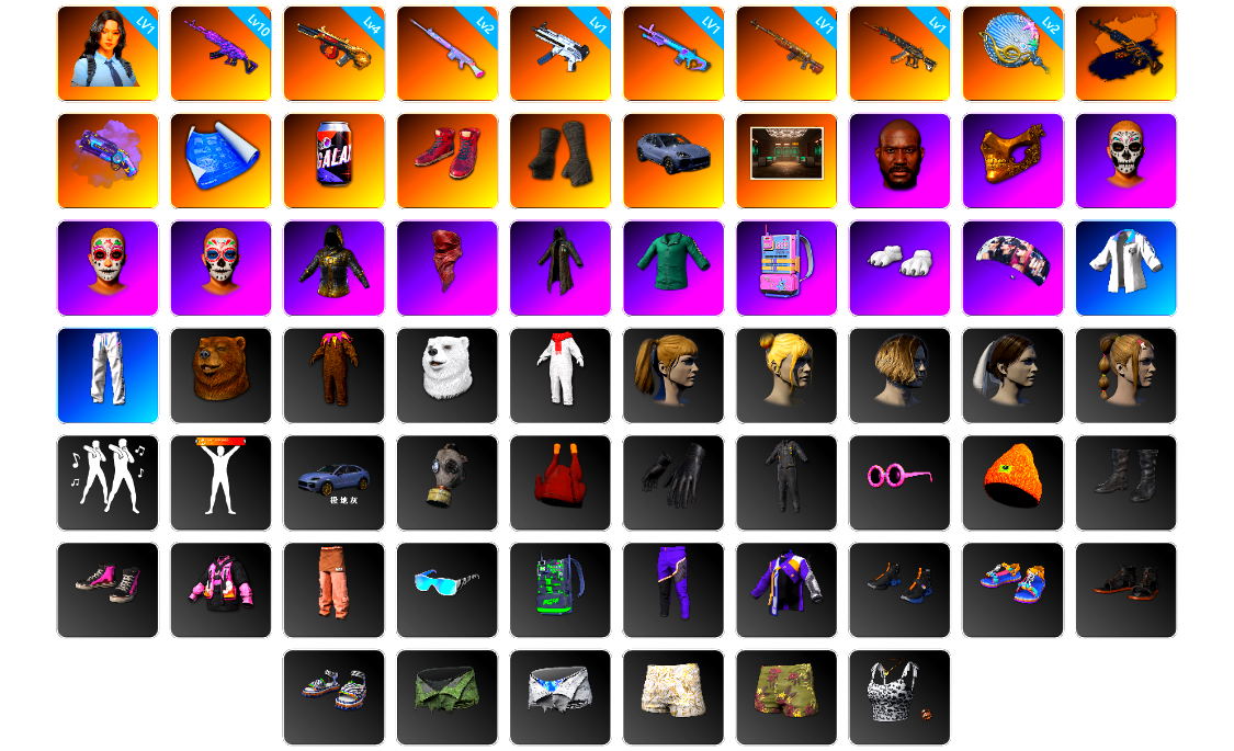 编号SP1428皮肤:1级瀚娜 10级美杜莎762 4级弥诺陶洛斯AUG 2级玩偶炮 1级无重力MP5K 1级魔咒之力Mk12 1级时光加农SKS 1级妖魔之触ACE 2级塞壬平底锅 美杜莎(异色) 紫色魔法迷雾-M79 张图纸 劲爆蓝莓 柏林鞋 黑绷带 保时捷卡宴 交易所接待室 黑鬼 金面 亡灵律动妆容 万寿菊狂欢妆容 午夜祭典妆容 GPT夹克 红面巾 黑大衣 活动绿东 电磁背包 白熊鞋 aespa女团 星魂猛虎下山运动夹克 星魂猛虎下山运动裤 杂技熊头套 杂技熊玩偶服 北极熊头套 北极熊连身衣 小马尾 丸子头 发型21 萨迪娅的头纱 发型61 青海摇 人型看板 Cayenne Turbo GT Paint (Arctic Grey) 黑血面具 火鸡帽子 黑血手套 黑血连身衣 暴躁花生墨镜 暴躁花生针织帽 黑血短靴 暴躁花生运动鞋 暴躁花生连帽卫衣 暴躁花生长裤 星魂猛虎下山滑雪镜 电波干扰背包 PNC 2025 全力出击长裤 PNC 2025 全力出击夹克 PNC 2025 全力出击运动鞋 日光下澈凉鞋 丝滑夏日凉鞋 漫步沙滩凉鞋 日光下澈丛林短裤 日光下澈热带短裤 丝滑夏日短裤(白色) 丝滑夏日短裤(橄榄绿) 日光下澈丛林上衣 日光下澈热带上衣 丝滑夏日上衣(白色) 丝滑夏日上衣(橄榄绿) 漫步沙滩连衣裙(棕色) 漫步沙滩连衣裙(蓝色) 银色美人飞行员夹克 无重力披风 鳄鱼大军泳裤 战术科技裤 猎手猫夹克 猎手猫上衣 猎手猫短裙 猎手猫皮鞋 特工小兔长袖上衣 特工小兔长裤 孤独情人 绒毛伙伴 绒毛伙伴 绒毛伙伴 绒毛伙伴 棉花糖帽子 极光之友 极光之友 蓄势待发 恐龙乐园 小青龙头套 小青龙玩偶服 小青龙脚套 柴犬帮 柴犬帮 柴犬帮 维娜托手套 维娜托口罩 维娜托水手 维娜托短裙 维娜托短靴 奶牛印花绑结式上衣(黑色) 维寒迪雪上运动夹克 维寒迪长裤 鸡警 鸡警短裤 头号主播 小恶魔纹身 金墨点染 金墨点染 金墨点染 群雄逐鹿 金墨点染 金墨点染 群雄逐鹿 群雄逐鹿 开拓者墨镜 开拓者手套 开拓者上衣 开拓者长裤 开拓者夹克 开拓者短鞋 魔力甜心萨莉的礼服(粉红色) 萨莉的皮鞋 萨莉的礼服 萨莉的长靴 萨莉的礼服 萨莉的皮鞋 萨莉2级头 小兔航天局 小兔航天局 小兔航天局 小兔航天局 小兔航天局 小兔航天局 小兔航天局 小兔航天局 小兔航天局 小兔航天局 小兔航天局 小兔学院 哥特上衣 哥特短裙 哥特长靴 发型60 发型59 节日装饰 肾上腺素 亲爱的... 朱莉 兔兔吹泡泡 月球漫步者 PNC 2025 012 - 头盔(3级) PNC 2025 全力出击 - 头盔(2级) 潜水教练 - 头盔(3级) 无痕之钢 - 头盔(3级) 无痕之钢 - 头盔(2级) 无痕之钢 - 头盔(1级) 迪厅镜面球 - 头盔(1级) 趣味狂欢 - 头盔(1级) 7周年快乐 - 头盔(1级) 狂人的摩托车 - 头盔(1级) 曼提柯尔黄色越野摩托 - 头盔(1级) 粉梦长眠 - 头盔(2级) 黄色尖角 - 头盔(2级) 群星之力 - 头盔(2级) 林德仪式头盔(1级) 守望之龙 - 头盔(3级) 数位传送 - 头盔(3级) 小兔航空航天局 - 头盔(3级) 维京勇士 - 头盔(3级) 鸡冠头 - 头盔(3级) PNC 2025 全力出击背包(2级) 来自乐园的问候背包(3级) PCS6 浓墨重彩背包(1级) 柴犬帮背包(1级) 甜蜜梦境背包(2级) 王牌登场 紫色棱镜背包(3级) 肆意挥洒背包(3级) 7周年快乐背包(3级) 迷人鲜花背包(3级) 突围而出背包(1级) 柴犬帮背包(3级) 踏浪而行降落伞 无重力降落伞 赛季31竞技降落伞 PCS5 降落伞 赛季28竞技降落伞 挣脱尘网降落伞 34赛季伞 赛季29竞技降落伞 赛季33竞技降落伞 雪花 潜行速降降落伞 乐园的问候 36赛季 赛季37竞技降落伞 马桶人降落伞 危险勿近套装 烤鸡节服饰套装 3 学院派套装 私立学校校服套装 模范生套装 小兔快递制服套装 大灰狼套装 尽染樱色套装 寻腥猎犬套装 美人鱼服饰套装 炫酷服饰套装 野猫套装 月影套装 拘束解除套装 蓝仙女套装 夜伴花开旗袍套装 高档服饰套装 运动风套装 咖啡王制服套装 街头风套装 牛年服饰套装 3 牛年服饰套装 4 牛年服饰套装 2 传奇队篮球套装 棕榈叶复古套装 红白方格夏日套装 夏日趣味套装 雪人套装 圣诞派对服饰套装 欢快麋鹿套装 夏日复古套装 波尔卡圆点夏日套装 斑点狗服饰套装 年末问候套装 圣诞老人自拍装套装 圣诞套装 吊带裤配蝴蝶结套装 灭世朋克套装 暗影之星的服饰套装 白毛柴犬帮套装 夏日开襟上衣套装 守护天使套装1 卡通学院套装 暗龙军团套装 生意兴隆套装 蓄势待发套装 龙之女皇套装 小兔快递配送套装 优雅夏日连衫裤套装 传奇高手套装 彩色标记套装 没错我有罪套装 突围而出套装 劫掠者套装 幸运怪盗套装 生存者车手服饰套装 高科技时尚小兔套装 远足者服饰套装 怪盗小兔套装 马戏团领班套装 打工小兔套装 角鲨队篮球套装 掠夺者队篮球套装 花卉印花套装 虚空女巫套装 怨恨小姐套装 检察官套装 诅咒狼人套装 复古沙漠套装 余波套装 私校制服套装 骑士套装 神射手套装 死亡六进制套装 废土套装 海湾救生员套装 窒息的爱套装 红桃皇后套装 兴致索然套装 烤鸡节服饰套装 4 烤鸡节服饰套装 2 烤鸡节服饰套装 1 春之月夜服饰套装 狂徒服饰套装 都市女牛仔服饰套装 西部警官服饰套装 春之步伐服饰套装 赫尔墨斯之翼套装 反光夹克俱乐部套装 亮片炫彩套装 聚星女士套装 绯红新星套装 寰宇侠套装 类星之王套装 沙漠骗徒套装 不毛之地套装 圣柱军团保安套装 使徒套装 疯狂科学套装 疯狂护士套装 天空队长套装 胜利收割者套装 铁娘子套装 专业守卫套装 PCS3 服饰套装 曼提柯尔黑色越野摩托服套装 曼提柯尔黄色越野