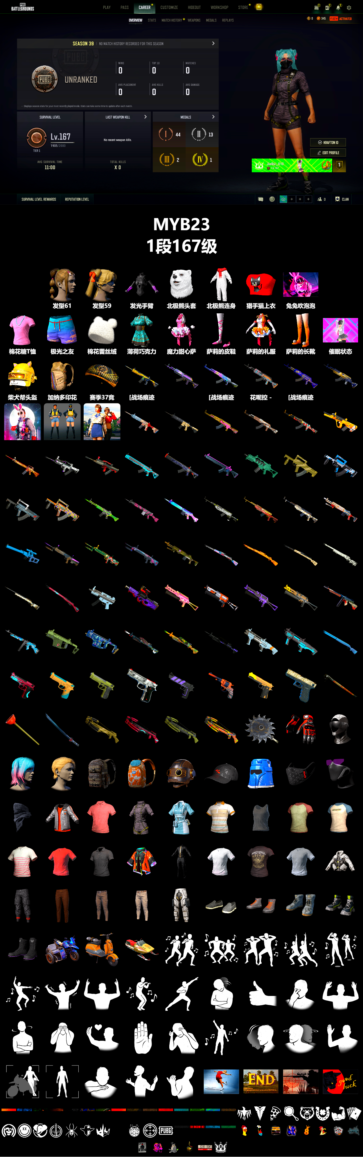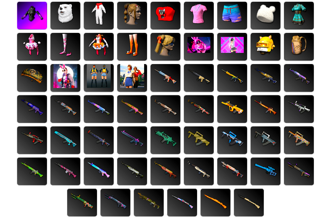 编号MYB23皮肤:发光手臂 北极熊头套 北极熊连身衣 发型61 猎手猫上衣 棉花糖T恤 极光之友 棉花蕾丝绒 薄荷巧克力 魔力甜心萨莉的礼服(粉红色) 萨莉的皮鞋 萨莉的礼服 萨莉的长靴 发型59 兔兔吹泡泡 催眠状态 柴犬帮头盔(3级) 加纳多印花背包(3级) 赛季37竞技降落伞 小兔学院生化服套装 小兔快递仓管套装 禁忌闪光套装 雪国风光 - M416 数码沙漠迷彩 - M416 [战场痕迹] 小兔巡逻队 - M416 PGC 2023 皇冠宝石 - Beryl M762 PGC 2022 王牌登场 - Beryl M762 [战场痕迹] 湮灭 - Beryl M762 花呢控 - Beryl M762 [战场痕迹] 破碎元素 - AKM 魔力甜心萨莉的挚友 - AKM 大理石宝藏 - AKM 蟒蛇花园 - AKM 金色续响 - AUG [战场痕迹] 朱雀之灵 - M16A4 分形几何 - QBZ 鎏金王朝 - QBZ 双色 - Mk47 Mutant 无尽迷宫 - Mk47 Mutant 心跳掠夺者 - Mk47 Mutant 丛林潜行者 - G36C 标准猎手 - Groza 方形铬印 - Groza 无尽迷宫 - Groza 山花烂漫 - Groza 无拘来世 - K2 水手 - SLR 彩虹之上 - SLR 分形几何 - SKS 镀金 - SKS 幸运骑士 - SKS 雪国风光 - Mk14 海洋哑光(蓝色) - VSS 鎏金王朝 - QBU 蟒蛇花园 - QBU 无信号 - QBU 赛季37竞技黄金 - Mk14 无慈悲 - Kar98k 粗糙 (橙色) - Kar98k 数码沙漠迷彩 - Kar98k 幽灵之握 - M24 幸运骑士 - M24 恶战 - 莫辛纳甘步枪 灰色系 - MP5K 沙悟净 - P90 Poof! - PP-19 Bizon 方形铬印 - PP-19 Bizon 双色 - PP-19 Bizon 沙漠烈阳 - PP-19 Bizon 雪国风光 - 汤姆逊冲锋枪 拼图 - 汤姆逊冲锋枪 海洋哑光(绿色) - Vector 鲜花之力 - Vector 圣诞之力 - DP-28 无拘来世 - DP-28 三重条纹 - DP-28 灰色系 - DBS 双色 - DBS 海洋哑光(蓝色) - S686 恶战 - P92 双色 - P92 都市猎手 - P92 三重彩 - P92 三重条纹 - 沙漠之鹰 水手 - R1895 沙漠烈阳 - P1911 数码沙漠迷彩 - P18C 陶土质感撬棍 马桶塞 暗黑断罪之剑 标准猎手 - 十字弩 恶战 - 十字弩 都市猎手 - 十字弩 甜蜜外衣 - 十字弩 历久弥新 - 平底锅 准备就绪手套 无重力重型护目镜 发型65 发型53 黑色铆钉背包(3级) 奶牛印花背包(1级) 高压 - 头盔(3级) 准备就绪鸭舌帽 1000 SPF 防晒帽 准备就绪口罩 PGC 2022 战术科技面罩 沙暴伪装丝巾 准备就绪夹克 马球衫 (粉红色) 朱莉的褐湾制服 疯狂护士制服 复古马球衫 背心 (深灰色) 插肩袖 T 恤 (红色/白色) 插肩袖 T 恤 (蓝色/白色) 条纹 T 恤 (粉红色) T恤 (红色) Polo衫(深灰色) 字节意志夹克 黑龙衬衫配长裤 T 恤 (白色) 先驱者衬衫 T 恤 (灰色) 无重力重型夹克 准备就绪长裤 西装裤子(棕色) 战斗裤 (棕色) 战斗裤 (卡其色) 无重力重型长裤 懒人鞋(灰色) 准备就绪运动鞋 高帮运动鞋 无重力重型防护靴 暗影突袭者短靴 “加塔尔越野赛”摩托车 “小兔快递配送员” 小型摩托车 “雪橇骑手” 雪地摩托 胜利之舞159 胜利之舞69 胜利之舞114 胜利之舞38 Victory Dance - 8th Anniversary 胜利之舞80 电击 #1 胜利之舞74 宇宙守护者姿势2 嫉妒 棒棒哒 挑衅 投降 不耐烦 我做了什么 谢谢 停止! 抖缩 庆祝 同意 反对 你好 大厅姿势2 大厅姿势1 你完蛋了 耸肩 过来 花样滑冰运动员 落幕 确认目标 祝你好运 生存等级:1段