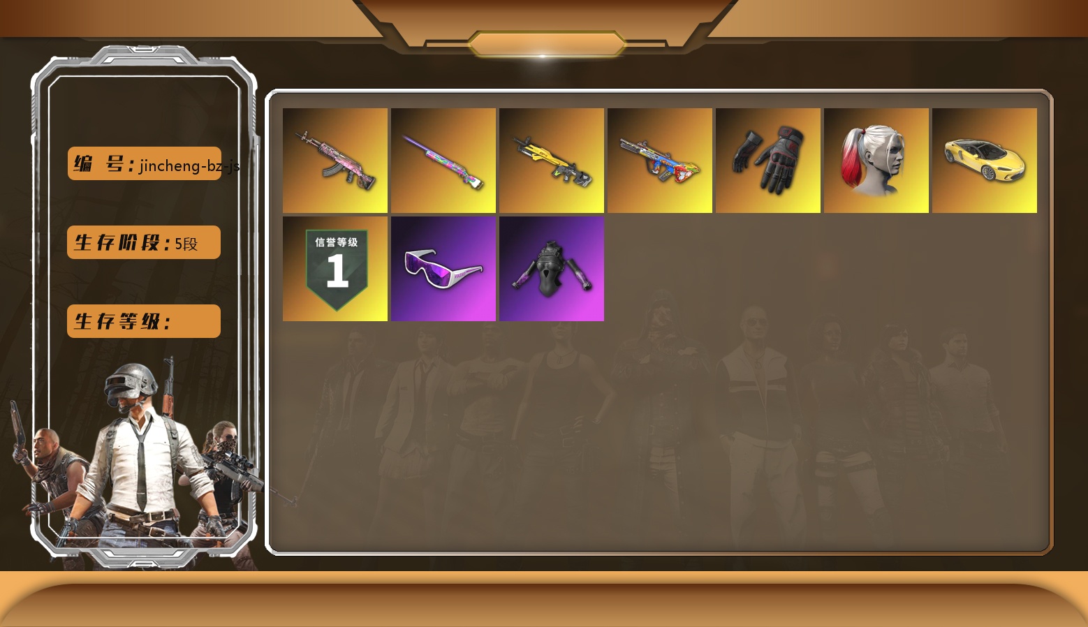 [jincheng-bz-js]五阶段 信誉等级一 9级爆裂AUG 10级火麒麟 1级小兔MK12 9级彩虹M24 发光手臂 K手套 小丑女 滑雪镜