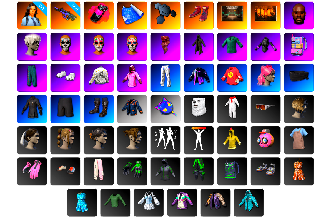 [JHJ178]1级瀚娜 10级霓虹AUG 品红色烟雾弹 张图纸 聚合物 柏林鞋 交易所接待室 武器神龛 黑鬼 9s发型 红面巾 黑大衣 活动绿东 发光手臂 电磁背包 萨芬裤 白熊鞋 粉战神 阿狸 尼尔 脏辫 青海摇 小兔学院 悲喜 绷带AK 滑雪帽