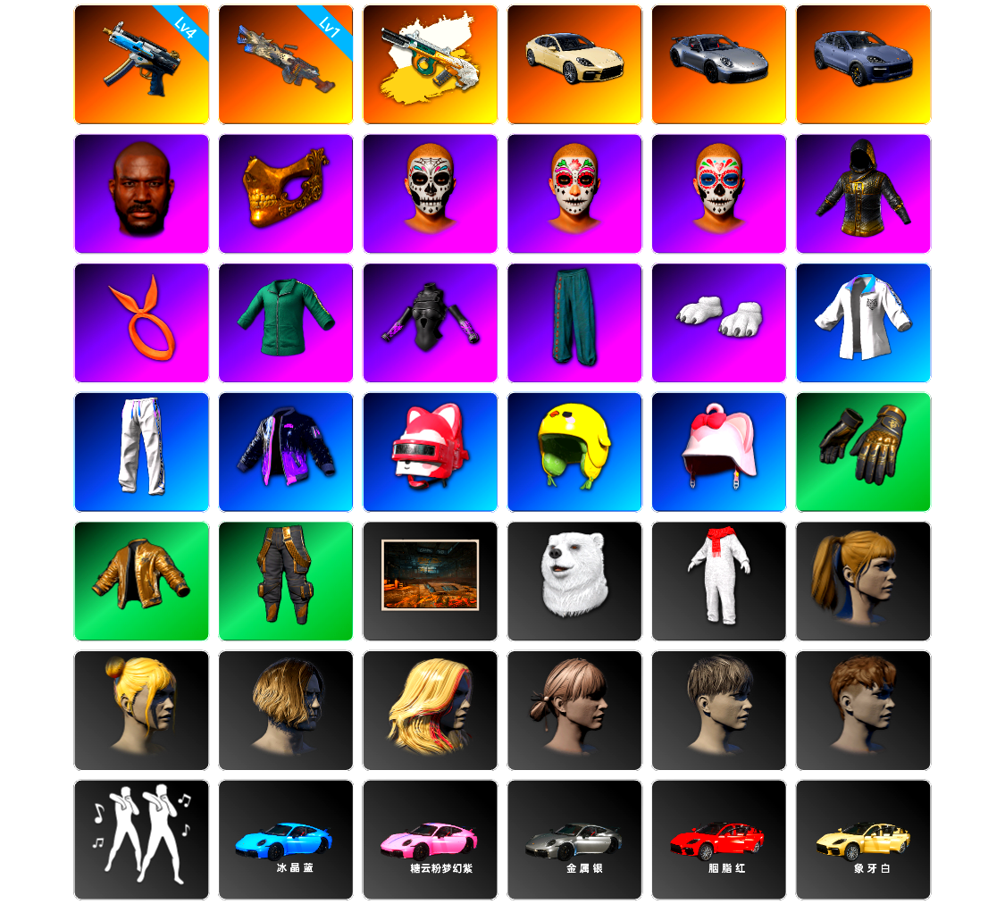 [WXZ1427]4级寒蚀MP5K 1级刻耳柏洛斯M249 弥诺陶洛斯AUG(异色) 帕拉梅拉 保时捷911 保时捷卡宴 黑鬼 金面 橙色发带 活动绿东 发光手臂 萨芬裤 白熊鞋 阿狸 拉风龙 后街车库 小马尾 丸子头 青海摇