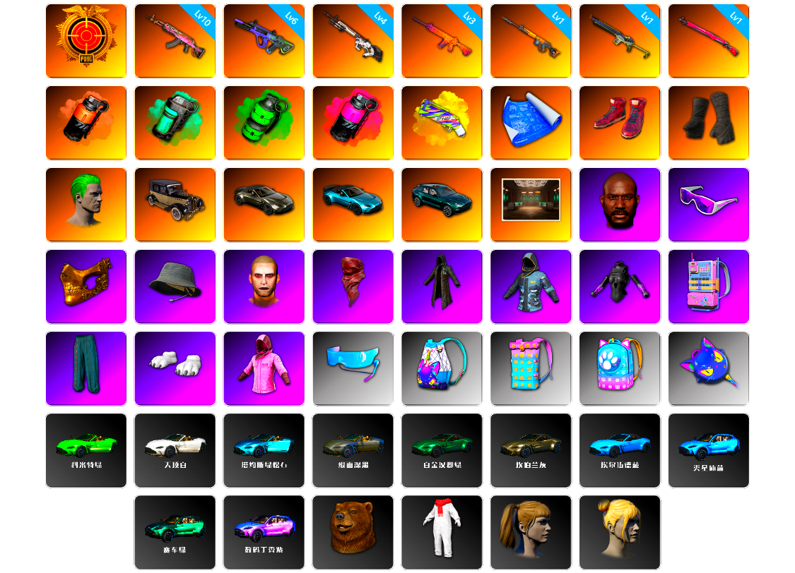 编号XZX97皮肤:神枪手金 10级火麒麟 6级霓虹AUG 4级赛博MK12 3级南瓜M4 1级齿轮炮 1级沙悟净MINI 1级午夜惊魂98K 珊瑚色烟雾弹 青色烟雾弹 翡翠色烟雾弹 品红色烟雾弹 黄色狂怒之雾-M79 张图纸 柏林鞋 黑绷带 小丑男 逃亡SUV 马丁跑车 马丁敞篷跑车 马丁SUV 交易所接待室 黑鬼 滑雪镜 金面 渔夫帽 丑男妆容 红面巾 黑大衣 小战神 发光手臂 电磁背包 萨芬裤 白熊鞋 粉战神 Aixleft 1级包 2级包 3级包 平底锅 (奢华版)科米特绿 车漆 Vantage(奢华版)车漆(缎面深黑) Vantage 车漆(坎伯兰灰) DBX707 车漆(阿斯顿·马丁赛车绿) 杂技熊头套 北极熊连身衣 小马尾 丸子头 发型21 萨迪娅的头纱 发型49 发型41 脏辫 发型24 类星之王 人型看板 冬梦女孩 冰雪天使连衣裙 复古痕迹夹克 零度机能风 小丑夜总会服饰 小可爱睡衣 斑斓危机 闪亮运动裤 鳄鱼大军泳裤 战术科技裤 三色猫连身衣 特工小兔长袖上衣 霓虹军团 霓虹军团 霓虹军团 霓虹军团 霓虹军团 小队队长 小队队长 小队队长 银河系女孩 银河系女孩 冬梦女孩 冬梦女孩 冬梦女孩 冬梦女孩 美杜莎上衣 美杜莎裤子 棉花糖手套 棉花糖马甲 棉花糖T恤 棉花糖短裤 棉花糖鞋 蓄势待发 恐龙乐园 恐龙乐园 恐龙乐园 柴犬帮 维娜托水手 维娜托短裙 维娜托短靴 轰炸机夹克 棉花蕾丝连衣裙 绒汪汪 紫喵喵手套 紫喵喵卫衣 亮片炫彩 上校的渔夫帽 上校的夹克 维寒迪雪上运动夹克 维寒迪长裤 老奶奶睡裙 老奶奶睡裤 沉睡女王 沉睡女王 绸缎长袖 绸缎睡裤 光滑丝质睡衣(蓝色) 光滑丝质睡裤(蓝色) 圣诞之子夹克 圣诞之子长裤 头号主播 战术科技夹克 OGBG 纹身 泡吧达人 晚餐幻象纹身 蜘蛛纹身 金墨点染 金墨点染 金墨点染 群雄逐鹿 金墨点染 金墨点染 群雄逐鹿 群雄逐鹿 开拓者墨镜 开拓者手套 开拓者上衣 开拓者长裤 开拓者夹克 开拓者短鞋 小兔航天局 小兔航天局 小兔航天局 小兔航天局 小兔航天局 小兔航天局 小兔航天局 小兔航天局 小兔航天局 小兔航天局 小兔学院 绒毛小恶魔圆头鞋 兔兔也朋克发箍 哥特上衣 哥特短裙 哥特长靴 悲喜 守护兽的凝视 不朽金箍 7周年快乐! 万圣之夜 万圣节大奖 战场恶犬 节日装饰 大猫狂怒 手绘的“举起手来” 亲爱的... 把钱交出来 隐藏奖励 猛虎 均衡器 花开 双龙出海 亲爱的,看锅! 大爆炸 游戏结束 恶魔的微笑 斗牛犬之怒 - 头盔(1级) 夏日安全 - 头盔(1级) 迪厅镜面球 - 头盔(1级) 糖果突击 - 头盔(1级) 小兔快递 - 头盔(1级) 猫咪挠 - 头盔(1级) 趣味狂欢 - 头盔(1级) 7周年快乐 - 头盔(1级) 兰博基尼 狂人的摩托车 - 头盔(1级) Carbon Fiber Commando - Helmet (Level 2) Vikendi Varsity - Helmet (Level 2) 奶牛印花 - 头盔(2级) 斑点狗 - 头盔(2级) 颤音战士 夹心软糖 - 头盔(2级) PCS5 磨砂炮铜 - 头盔(2级) 恐龙儿 - 头盔(2级) PGC 欧姆的头盔 - 头盔(1级) 林德仪式头盔(1级) 战士阿冰 - 头盔(3级) 守望之龙 - 头盔(3级) 沙滩狂战士 - 头盔(3级) 圣诞型男 - 头盔(3级) 迪厅镜面球 - 头盔(3级) 赫尔墨斯之翼 - 头盔(3级) 8th Anniversary - Helmet (Level 3) “熊宝贝” - 头盔(3级) 鸡冠头 - 头盔(3级) PCS6 浓墨重彩背包(1级) 柴犬帮背包(2级) 皇冠宝石 小兔航空航天局背包(2级) PCS7 背包(2级) PCS5 大巧不工背包(2级) 王牌登场 紫色棱镜背包(3级) 肆意挥洒背包(3级) 沙滩风情背包(3级) 小兔快递背包(3级) 一夜好眠背包(3级) 恐龙乐园时尚背包(1级) 突围而出背包(1级) 废土流浪者背包(3级) 美杜莎背包 柴犬帮背包(3级) 欧姆的背包(3级) 废土拾荒者背包(3级) 上校的降落伞 Vikendi Varsity Parachute PGC 2022 降落伞 踏浪而行降落伞 冬雪欲来降落伞 彩色标记降落伞 挣脱尘网降落伞 阿斯顿·马丁降落伞 PGC 2019 降落伞 赛季25竞技降落伞 PGC 2021 降落伞 烈焰吐息降落伞 PCS1 降落伞 公路王牌降落伞 赛季26竞技降落伞 雪花 蒸汽之翼降落伞 潜行速降降落伞 晚秋-M416 柠檬汁 - M416 无慈悲 - M416 雪国风光 - M416 PGC 2022 王牌登场 - Beryl M762 花呢控 - Beryl M762 鎏金王朝 - Beryl M762 毒性 - Beryl M762 精巧机械 - AKM 绷带AK 标准猎手 - AKM 奥丁的先锋 - AKM [战场痕迹] 孙悟空 - AKM 彩糖蛋糕 - AUG 金色续响 - AUG [战场痕迹] 进军亚特兰蒂斯 - AUG 守望之龙 - AUG 大理石宝藏 - ACE32 [战场痕迹] 瓦尔哈拉 - ACE32 [战场痕迹] 青龙之灵 - ACE32 PNC 2023 完美角度 - ACE32 霓虹之星 - SCAR-L 假日精神 - SCAR-L 三重彩 - SCAR-L 粗糙 (橙色) - SCAR-L 镀银 - SCAR-L [战场痕迹] 猩红时刻 - M16A4 华夫饼 - M16A4 分形几何 - QBZ 鎏金王朝 - QBZ 金色落叶 - Mk47 Mutant 标准猎手 - G36C 钴蓝呼号 - G36C 快车道 - Groza 镀金 - Groza 无拘来世 - K2 [战场痕迹] 彩虹之上 - K2 无慈悲 - K2 [战场痕迹] 瓦尔哈拉 - SLR PGC 2022 王牌登场 - SLR 水手 - SLR [战场痕迹] 猛虎猎手 - SLR 彩虹之上 - SLR 金色落叶 - SKS 分形几何 - SKS [战场痕迹] 蒸汽计量表 - SKS [战场痕迹] 剧变熔岩 - SKS 礼品店 - SKS 镀金 - SKS 彩虹之上 - Mini14 [战场痕迹] 黑暗深渊 - Mini14 死亡六进制 - Mini14 [战场痕迹] 破碎元素 - Mini14 幽灵之握 - Mk12 猪八戒 - Mk12 雪国风光 - Mk14 孙悟空 - Mk14 标准猎手 - VSS 银河小队 - VSS 璀璨星光 - QBU 鎏金王朝 - QBU 蟒蛇花园 - QBU 钴蓝枪匠 - QBU 逆袭斗犬 - Win94 数码沙漠迷彩 - Win94 镀金 - Win94 礼物环绕 - Kar98k PNC 2023 完美角度 - Kar98k [战场痕迹] 镀金枪儿响叮当 - Kar98k 猪八戒 - AWM 魔女之力 - AWM 镀金 - AWM 沫子的M24 劫掠者 - M24 [战场痕迹] 粉梦长眠 - M24 [战场痕迹] 湮