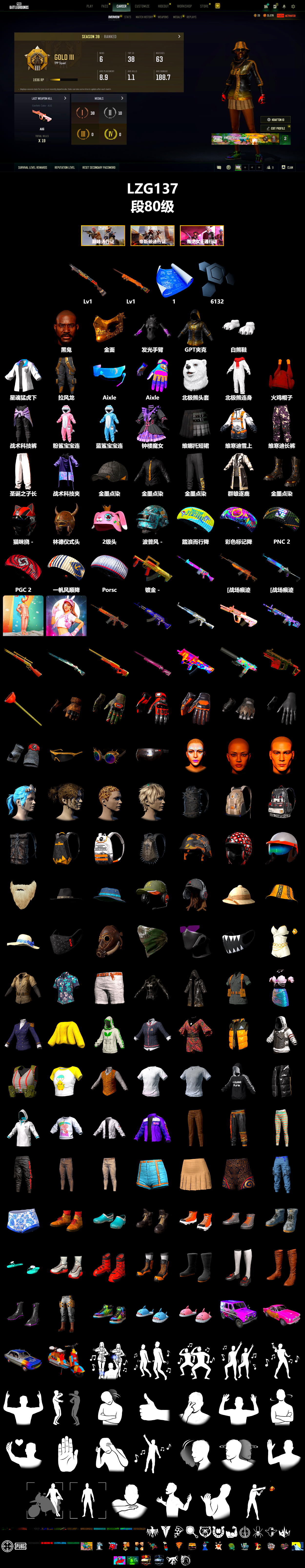 编号LZG137皮肤:1级烈日灼烧-S1897 1级夜曲M24 张图纸 聚合物 黑鬼 金面 GPT夹克 发光手臂 白熊鞋 星魂猛虎下山运动夹克 拉风龙 Aixleft Aixleft 北极熊头套 北极熊连身衣 火鸡帽子 战术科技裤 粉鲨宝宝连身睡衣 蓝鲨宝宝连身睡衣 钟楼魔女 维娜托短裙 维寒迪雪上运动夹克 维寒迪长裤 圣诞之子长裤 战术科技夹克 金墨点染 金墨点染 金墨点染 群雄逐鹿 金墨点染 小兔学院 猫咪挠 - 头盔(1级) 林德仪式头盔(1级) 波普风 - 头盔(3级) 踏浪而行降落伞 彩色标记降落伞 PNC 2023 降落伞 PGC 2019 降落伞 一帆风顺降落伞 Porsche Parachute 美美的睡衣套装 小兔学院水手服套装 [战场痕迹] 剧变熔岩 - M416 [战场痕迹] 湮灭 - Beryl M762 Winter Reign - AKM 彩糖蛋糕 - AUG 镀金 - Groza 魔力宝贝 - SLR [战场痕迹] 剧变熔岩 - SKS [战场痕迹] 破碎元素 - Mini14 孤独情人 - Mk12 镀金 - Win94 礼物环绕 - Kar98k 镀金 - AWM [战场痕迹] 粉梦长眠 - M24 熔岩灯 - JS9 抽象派 - MP9 镀金 - Vector 马桶塞 人类猎手探险手套 队长的迷彩手套 准备就绪手套 维寒迪雪上运动手套 大麻烦手套 PGC 2022 战术科技手套 PGC 2019 护手和智能手表 乔纳森的猎人墨镜 沙漠骗徒护目镜 PGC 2019 眼镜 美人鱼妆容 女性面容20 男性面容18 美人鱼发型 发型30 发型46 发型64 束缚之链背包(3级) 狮鹫传说背包(2级) PGC 2019 背包 (2级) 束缚之链背包(2级) 勇往直前背包(1级) 维寒迪雪上运动背包(1级) 束缚之链背包(1级) PUBG信条 - 头盔(2级) 同花大顺 - 头盔(1级) 维寒迪雪上运动 - 头盔(1级) 圣诞老人胡须 快枪手牛仔帽 夏日渔夫帽(蓝绿色) 队长的迷彩鸭舌帽 PGC 2019 头饰 人类猎手探险帽 寄情尼罗河渔夫帽 青花怒放宽檐帽 准备就绪口罩 天空队长面具 队长的迷彩面巾 PGC 2022 战术科技面罩 优雅夏日连衫裤 人类猎手探险服 花衬衫(蓝绿色) 夏日短裤(灰色) 朱莉的潜行者夹克 朱莉的防尘外套 军用夹克 美人鱼服饰 海军军官制服外套 小小鸡仔外套 生存练习生连帽卫衣 学院派上衣 快枪手上衣 PUBG信条马甲 PGC 2019 战术连帽卫衣 坚持到底上衣 小小鸡仔T恤 马戏团领班马甲 T 恤 (白色) T 恤 (灰色) 暗夜追踪者马甲 雨中漫步夹克 贺岁独角兽长袖运动衫 雪地迷彩夹克 PNC 2025 夹克 条纹长裤(棕色) 符文袭击者长裤 条纹睡裤 PGC 2019 战斗长裤 战斗裤 (棕色) 战斗裤 (卡其色) 小小鸡仔短裤 学院派百褶裙 挪威皇家短裤 雪地工装裤 青花怒放比基尼短裤 唯一的爱休闲鞋 沙滩鞋(蓝绿色) 寻腥猎犬短靴 维寒迪雪上运动短靴 准备就绪运动鞋 高帮运动鞋 美人鱼拖鞋 PGC 2019 运动鞋 海洋独行侠短靴 PCS3 逐日者长靴 保暖作战靴 学院派皮鞋配长袜 快枪手长靴 PGC 2022 战术科技短靴 人类猎手探险长裤 彩虹漫游者运动鞋 蓝鲨宝宝睡拖 粉鲨宝宝睡拖 “间谍软件” 乌阿斯吉普车 “速度与金毛” 库佩RB “彩虹四溢” 达西亚轿车 “缝缝补补” 小型摩托车 Dark Arts(第1部分) 胜利之舞112 胜利之舞122 胜利之舞142 胜利之舞19 #1 特殊问候 嫉妒 棒棒哒 挑衅 投降 不耐烦 谢谢 停止! 抖缩 庆祝 同意 反对 你好 大厅姿势2 大厅姿势1 你完蛋了 耸肩 过来 Porsche - There is no substitute 生存等级:段
