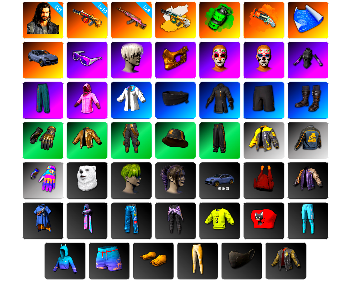 编号PZ2981皮肤:1级多利安 10级弥诺陶洛斯AUG 8级火麒麟 弥诺陶洛斯AUG(异色) 翡翠色烟雾弹 橙色狂怒之雾-M79 张图纸 保时捷卡宴 滑雪镜 9s发型 金面 万寿菊狂欢妆容 午夜祭典妆容 发光手臂 萨芬裤 粉战神 星魂猛虎下山运动夹克 尼尔 拉风龙 鸡斯卡夹克 PCL夹克 Aixleft 北极熊头套 小绿头 发型35 Cayenne Turbo GT Paint (Arctic Grey) 火鸡帽子 零度机能风 无重力披风 斑斓危机 闪亮运动裤 战术科技裤 3号长袖运动衫 猎手猫上衣 棉花糖短裤 极光之友 极光之友 恐龙乐园 柴犬帮 维娜托口罩 轰炸机夹克 棉花蕾丝连衣裙 绒汪汪 紫喵喵手套 紫喵喵卫衣 紫喵喵长裤 紫喵喵短靴 维寒迪雪上运动夹克 维寒迪长裤 沉睡女王 圣诞之子夹克 圣诞之子长裤 头号主播 战术科技夹克 Twitch Rivals 复古飞行员夹克 OGBG 纹身 泡吧达人 晚餐幻象纹身 小恶魔纹身 金墨点染 金墨点染 金墨点染 群雄逐鹿 金墨点染 金墨点染 群雄逐鹿 群雄逐鹿 萨莉的礼服 萨莉的皮鞋 小兔航天局 小兔航天局 小兔学院 绒毛小恶魔圆头鞋 哥特短裙 悲喜 万圣节大奖 肾上腺素 回归 让子弹飞 复古兜风 隐藏奖励 猛虎 流水线 均衡器 双龙出海 月球漫步者 斗牛犬之怒 - 头盔(1级) 迈凯伦 - 头盔(1级) 斑点狗 - 头盔(2级) 嘻哈风 - 头盔(2级) PGC 战术科技 迪厅镜面球 - 头盔(3级) 塞壬背包 王牌登场 PGC 2022 王牌登场背包(3级) 夏日远足背包(3级) 柴犬帮背包(3级) 炼狱之角背包(2级) 废土拾荒者背包(3级) PGC 2022 降落伞 无重力降落伞 迈凯伦降落伞 34赛季伞 赛季20竞技降落伞 PGC 2019 降落伞 赛季33竞技降落伞 蒸汽之翼降落伞 36赛季 赛季38竞技降落伞 杂技熊服饰套装 粗糙 (橙色) - M416 地狱火 - M416 雪国风光 - M416 PGC 2022 王牌登场 - Beryl M762 [战场痕迹] 危险玩偶屋 - Beryl M762 [战场痕迹] 破碎元素 - AKM 绷带AK 灵魂枷锁 - AKM [战场痕迹] 进军亚特兰蒂斯 - AUG [战场痕迹] 瓦尔哈拉 - ACE32 大理石宝藏 - ACE32 亡灵之花 - SCAR-L [战场痕迹] 朱雀之灵 - M16A4 [BATTLESTAT] Abracadabra Automatic - QBZ 心跳掠夺者 - Mk47 Mutant 灰色系 - Mk47 Mutant 分形几何 - G36C PGC 2022 王牌登场 - Groza 镀金 - Groza 无慈悲 - K2 PGC 2022 王牌登场 - SLR [战场痕迹] 赛博危机 - SLR 魔力宝贝 - SLR [战场痕迹] 蒸汽计量表 - SKS 甜蜜外衣 - Mini14 彩虹之上 - Mini14 [战场痕迹] 破碎元素 - Mini14 彩虹四溢 - Mk12 雪国风光 - Mk14 孙悟空 - Mk14 鎏金王朝 - QBU 精致奥索莫科 - QBU 亡灵之花 - 德拉贡诺夫 余音环绕 - 十字弩 镀金 - Win94 内马尔JR的M24 海兽 - 莫辛纳甘步枪 彩糖蛋糕 - 莫辛纳甘步枪 疯狂收割者 - MP5K 赛季38竞技铂金 - P90 竞速之道 - P90 沙漠烈阳 - PP-19 Bizon 镀金 - UMP 回收再利用 - UMP 抽象派 - MP9 回收再利用 - DP-28 水手 - S1897 灰色系 - S686 沙漠烈阳 - 沙漠之鹰 数码沙漠迷彩 - P18C 马桶塞 回收再利用 - 十字弩 碎瓜者 - 平底锅 8th Anniversary - Pan 午餐肉的护手绷带 兔兔也朋克手套 天空队长手套 队长的迷彩手套 战场老兵手套 准备就绪手套 海军军官制服手套 维寒迪雪上运动手套 骷髅脸特技手套 朱莉的手套 小兔快递配送员手套 PGC 2022 战术科技手套 PGC 2022 斑斓危机手套 无重力中型手套 工人手套(白色) 万寿菊狂欢手套 午夜祭典手套 般若手套 革面悍匪手套 无重力重型手套 暗夜追踪者手套 金底耐磨手套 宇宙灵狐手套 无重力轻型手套 PGC 2019 护手和智能手表 女明星眼镜(白色) 红桃皇后墨镜 飞行员太阳镜(琥珀色) 雪片墨镜 死亡六进制太阳镜 PGC 2022 斑斓危机墨镜 暗影突袭者墨镜 PGC 2019 眼镜 无重力重型护目镜 PGC 2021 黑暗凝视妆容 PCS7 冠军妆容 女性面容10 男性面容10 马蹄铁型小胡子 冬眠后的胡子 小胡子 无重力妆容 发型67 发型14 发型85 海湾救生员背包(3级) 花卉印花背包 (2级) 马戏棚背包(2级) 白蛇背包 (2级) 沙滩小径背包(2级) PGC 2019 背包 (2级) PCS2 弹药库背包(2级) 恐龙皮背包(2级) 彩绘祭坛背包(2级) 无重力背包(2级) 寻腥猎犬背包(1级) 维寒迪雪上运动背包(1级) 正义之诗背包 (1级) 神枪手背包(1级) 一夜好眠背包(1级) 破碎硬壳背包(1级) 迈凯伦背包(1级) 金色头冠 - 头盔(3级) 无重力 - 头盔(3级) 噬命雏菊 - 头盔(2级) 军用防弹头盔(2级) 死亡六进制 - 头盔(2级) 豹纹斑点 - 头盔(2级) 黑蜘蛛 - 头盔 (1级) 维寒迪雪上运动 - 头盔(1级) 狂乱深渊 - 头盔(1级) 金沙 - 头盔(1级) 圣诞马脸面具 雪人头套 狐狸侯爵面具 南瓜头 86冒险家渔夫帽 大吉大利帽 缤纷圣诞帽 快枪手牛仔帽 费多拉帽 夏日渔夫帽(蓝绿色) 迈凯伦鸭舌帽(白色) 准备就绪鸭舌帽 复古棒球帽 (白色) 人类猎手鸭舌帽 队长的迷彩鸭舌帽 骑师帽 PCS4 织网鸭舌帽(白色) 春之步伐领巾 PGC 2019 头饰 潜水大师头盔 沙滩作战部队水桶 无重力中型护目镜 企鹅毛球针织帽 万寿菊狂欢发带 午夜祭典帽子 革面悍匪帽 圣诞之子针织帽 无重力宇航头盔 PCS7 面罩 准备就绪口罩 PCS2 隐形生存者面巾 黑蜘蛛面具 迷雾追踪者口罩 防毒面具 (半面罩) 队长的迷彩面巾 猩红猎手面具 沉睡女王睡眠眼罩 幸运怪盗面具 BLACKPINK 头戴式麦克风 皇室摔跤手面具 PGC 2022 战术科技面罩 冰冷微小面罩 般若面具 九尾狐面具 革面悍匪面具 内马尔JR的T恤 炫酷反光夹克 蟒蛇花园夹克 86冒险家夹克 准备就绪夹克 破裂棱镜夹克 条纹生存者连帽夹克 红魔夹克 PCS2 竞争者连帽卫衣 马球衫 (粉红色) 小兔叽上衣 密使夹克 皇室上衣 雪人玩偶服 治安队外套 花衬衫(蓝绿